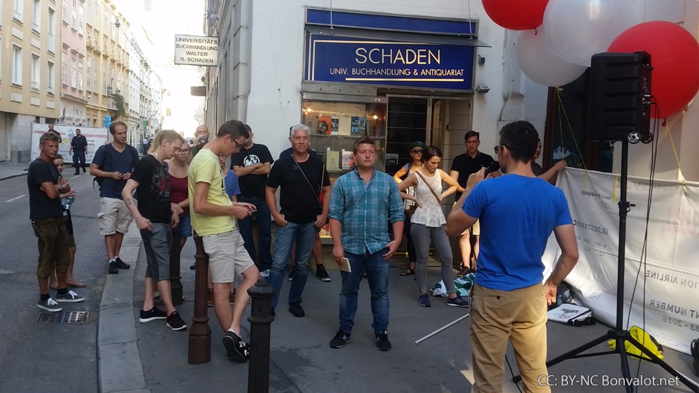 Trotz Unterstützung von IB-AktivistInnen aus Niederösterreich, der Steiermark, Salzburg und Tirol erschienen nur knapp 60 Personen zur Kundgebung der NeofaschistInnen. Der Sprecher der Gruppe, Martin Sellner, versuchte die geringe TeilnehmerInnenzahl vor Ort in seinen Ansprachen wiederholt mit dem gleichzeitig stattfindenden Match des SK Rapid Wien zu erklären. Auf seine Frage, ob auch andere Fußballfans anwesend seien, reagierte allerdings niemand. In seiner Ansprache kündigte Sellner schließlich eine neue Kampagne unter dem Titel „Integrationslüge“ an und bezog sich dabei wiederholt positiv auf den ehemaligen Bundesrat der Grünen, Efgani Dönmez.