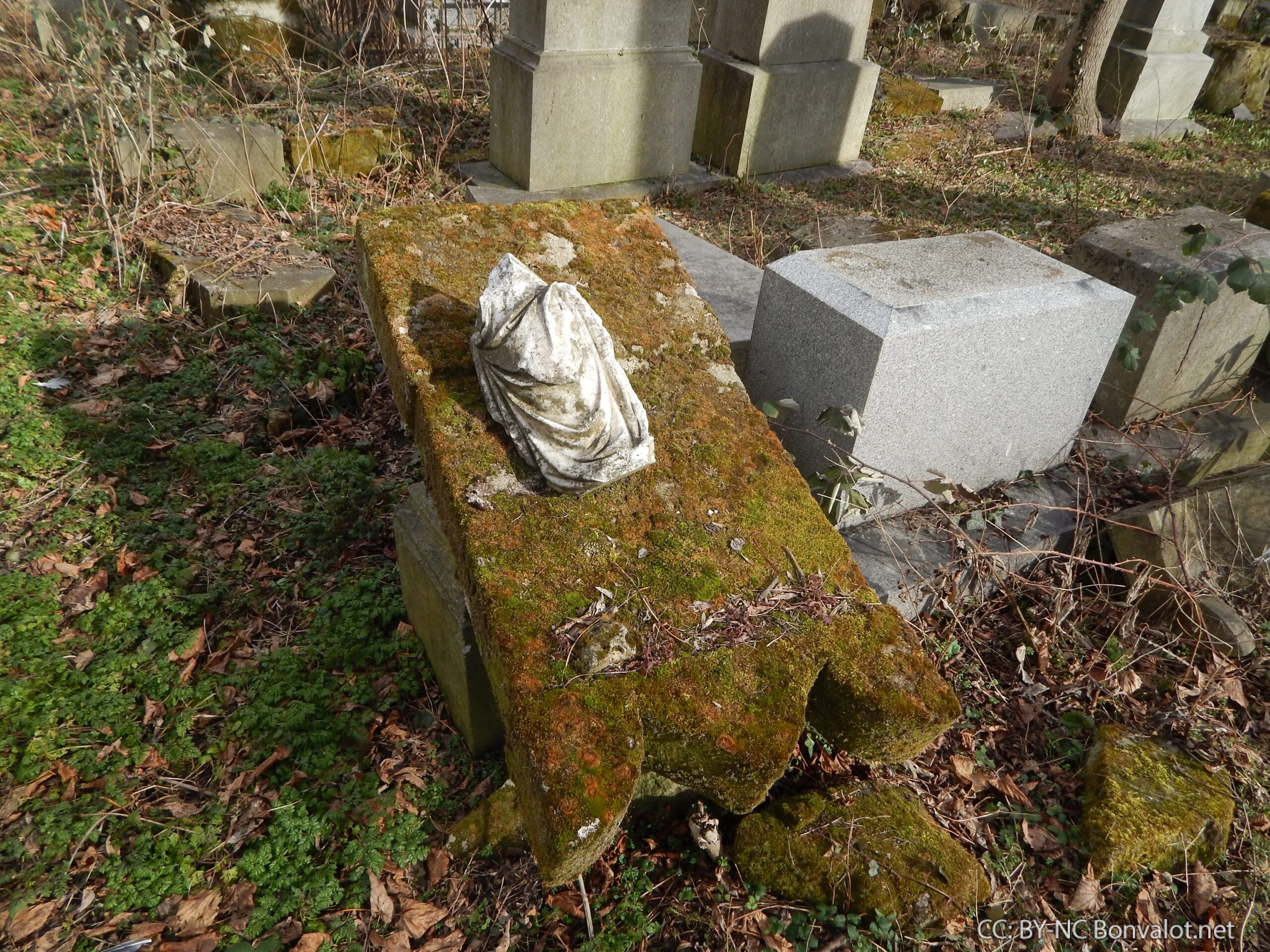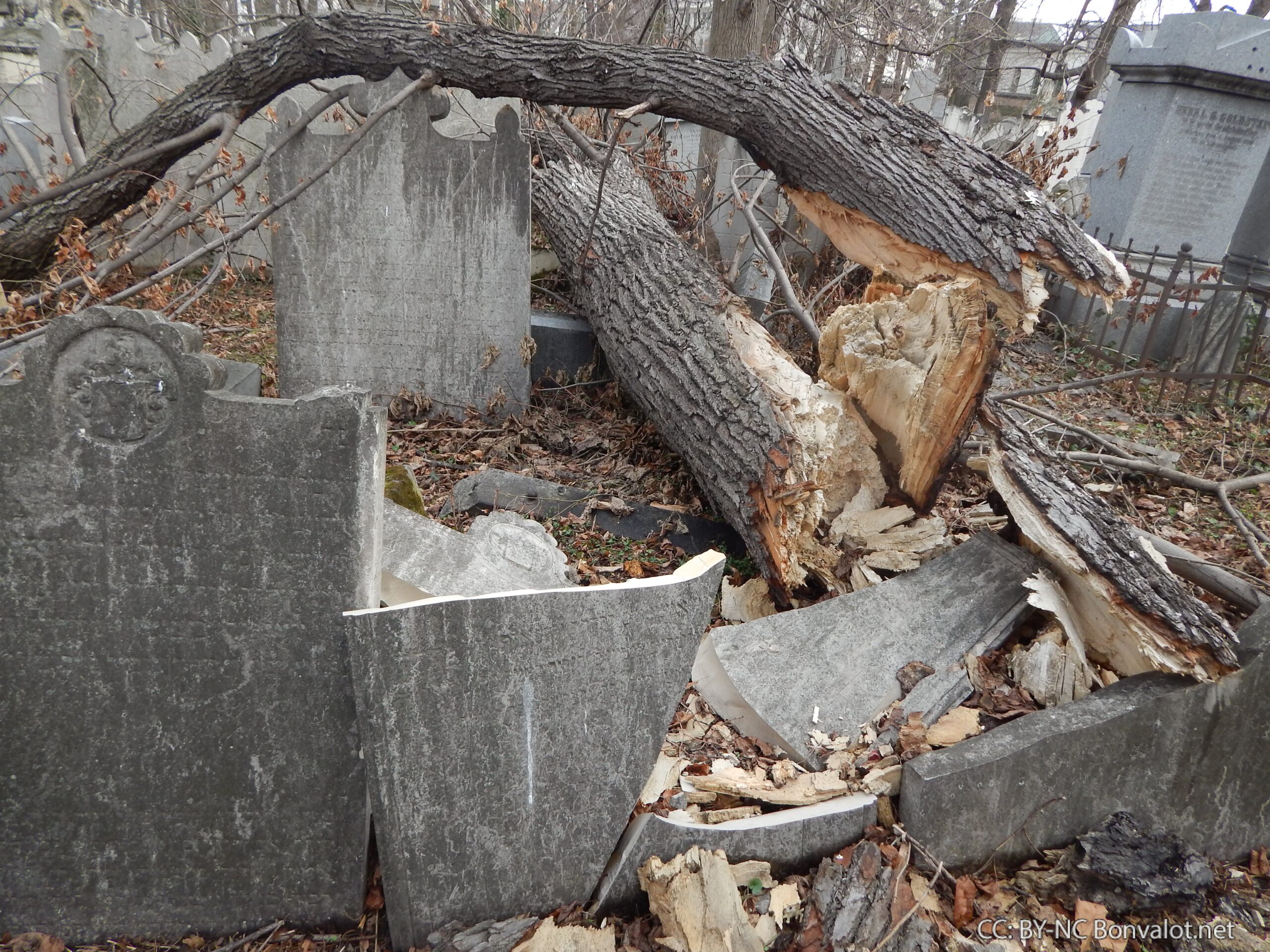 So sollte kein Friedhof aussehen: umgestürzte Bäume, dichtes Gestrüpp, dazwischen zerbrochene Grabplatten. Manche Gräber sind fast völlig zerstört, teilweise stehen sie sogar offen.