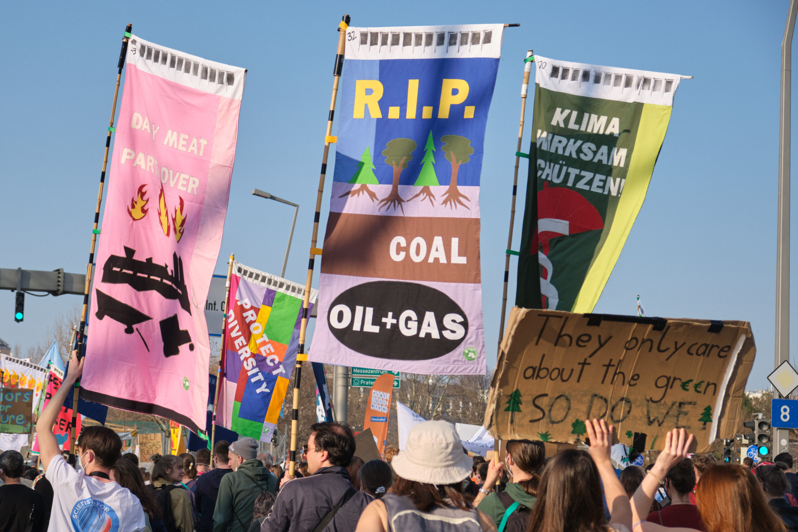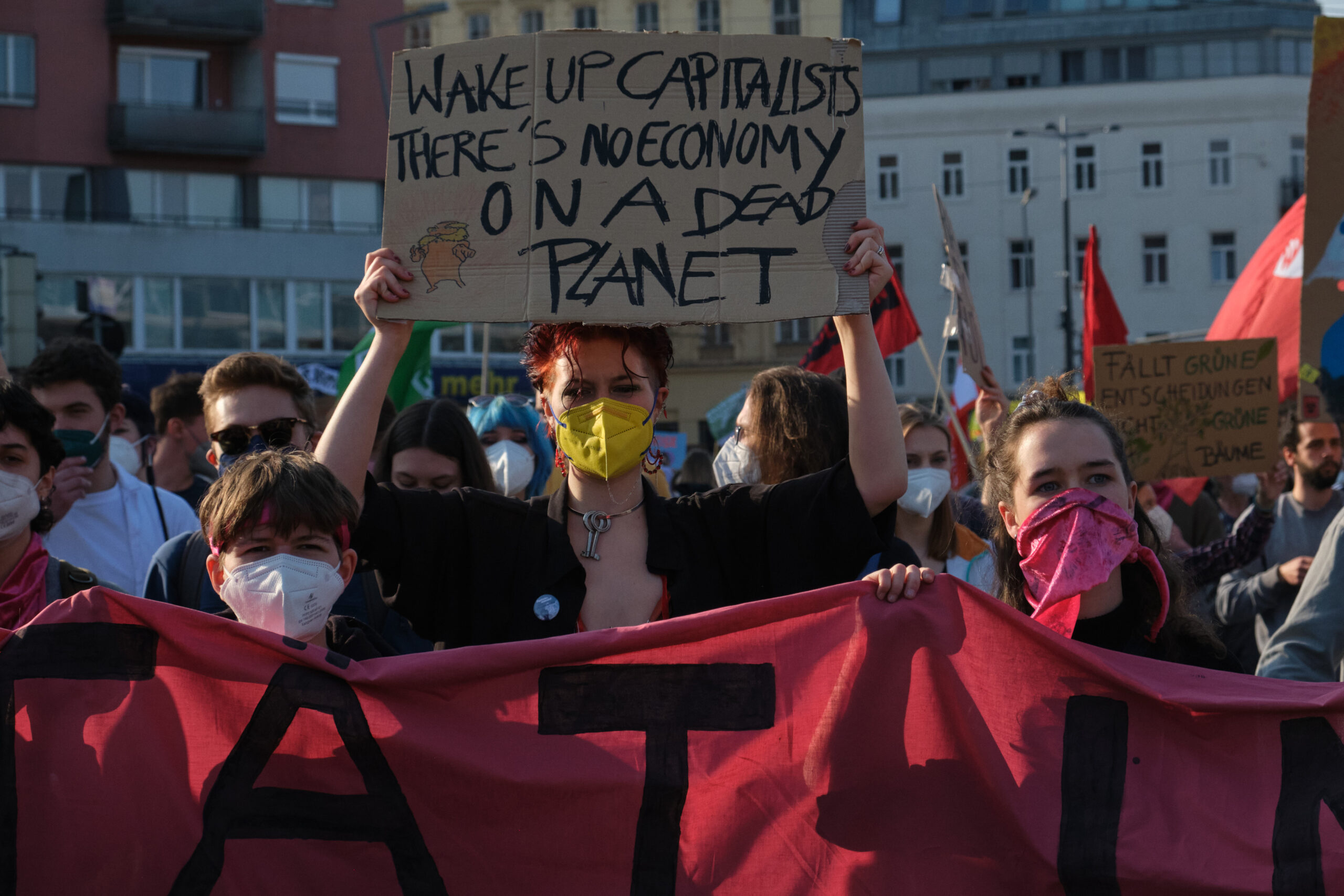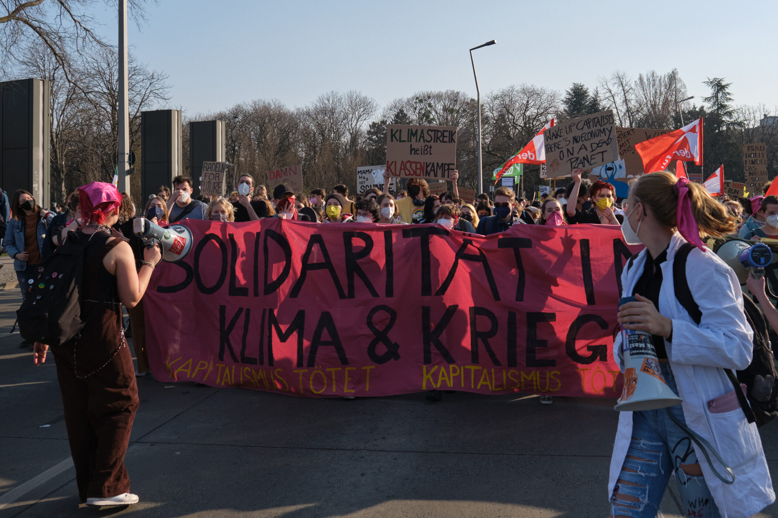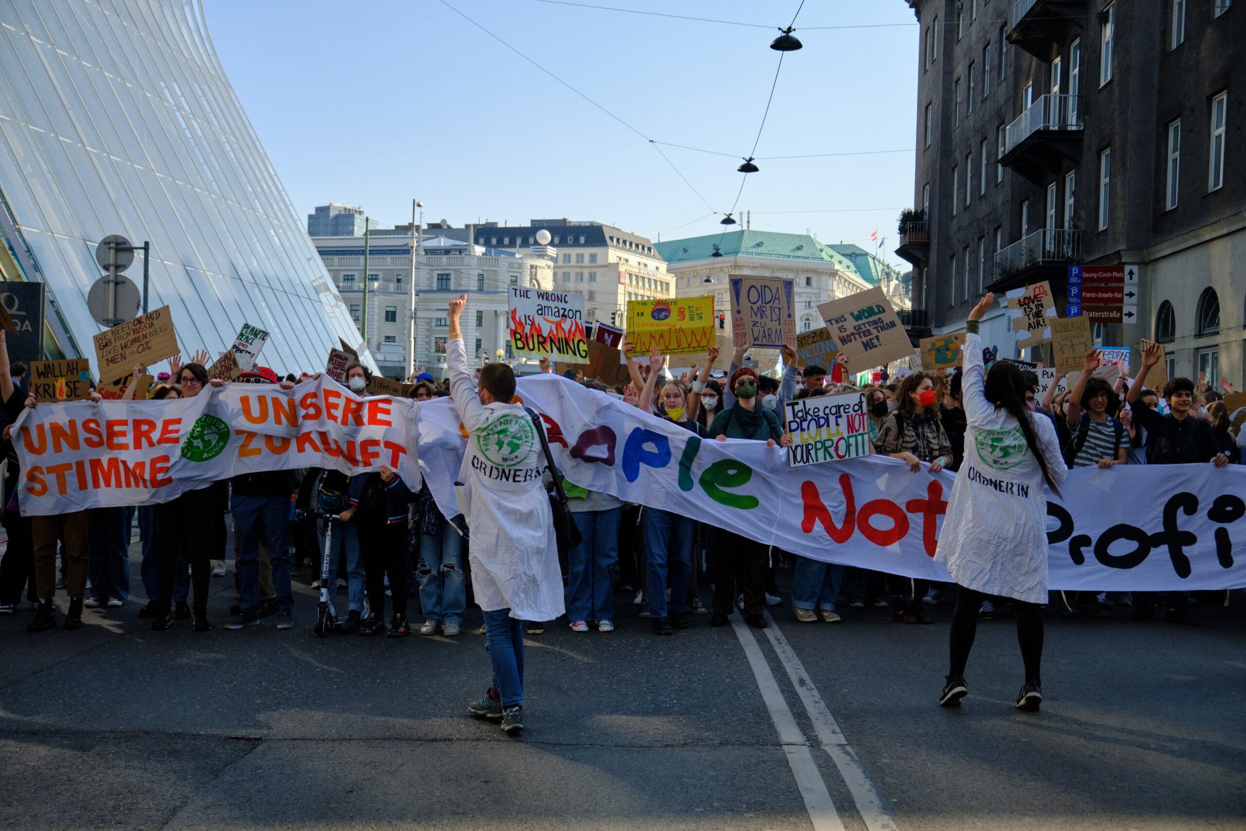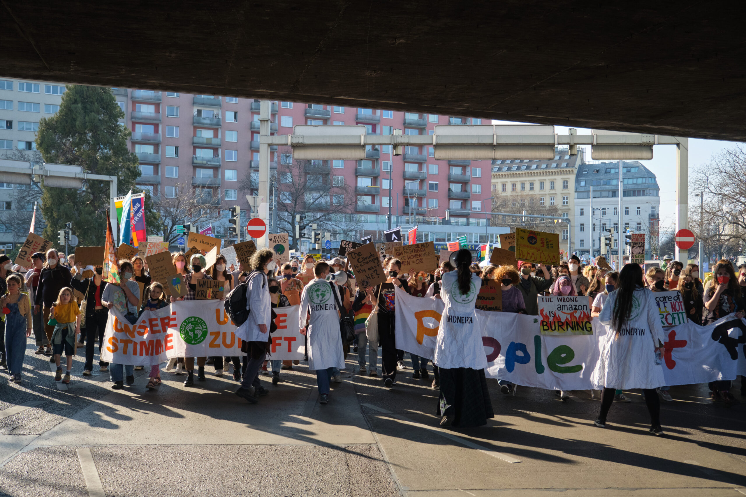 „A – Anti – Anticapitalista“ und „Hoch die internationale Solidarität“ – lautstark gibt der antikapitalistische Block die Parolen vor, angeführt vom „Jugendrat“. Vorneweg gleichzeitig ein starker Block von „Fridays for Future“. Sprechchöre gegen Ölkonzerne und die in Wien geplanten Auto-Monsterprojekte Stadtautobahn und Lobautunnel hallen über die Wiener Praterstraße.