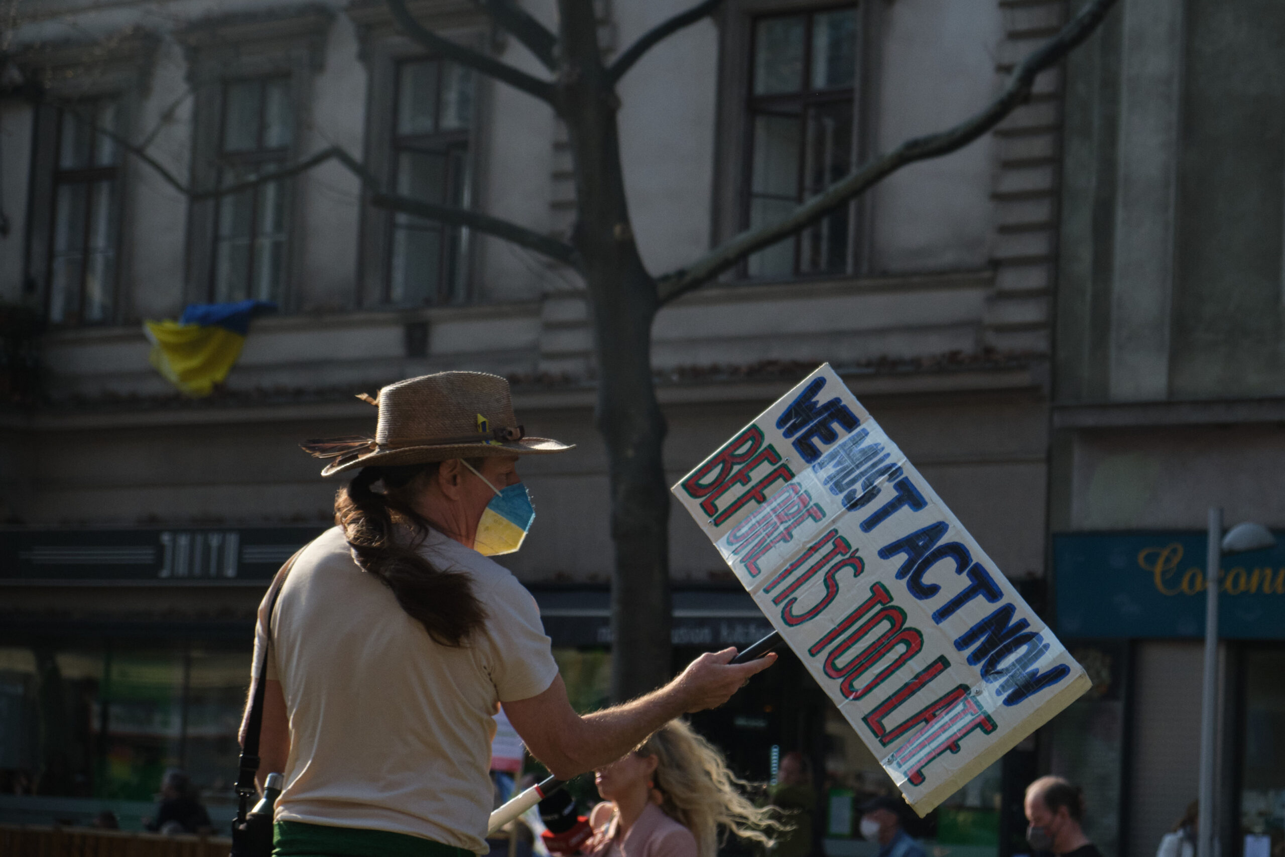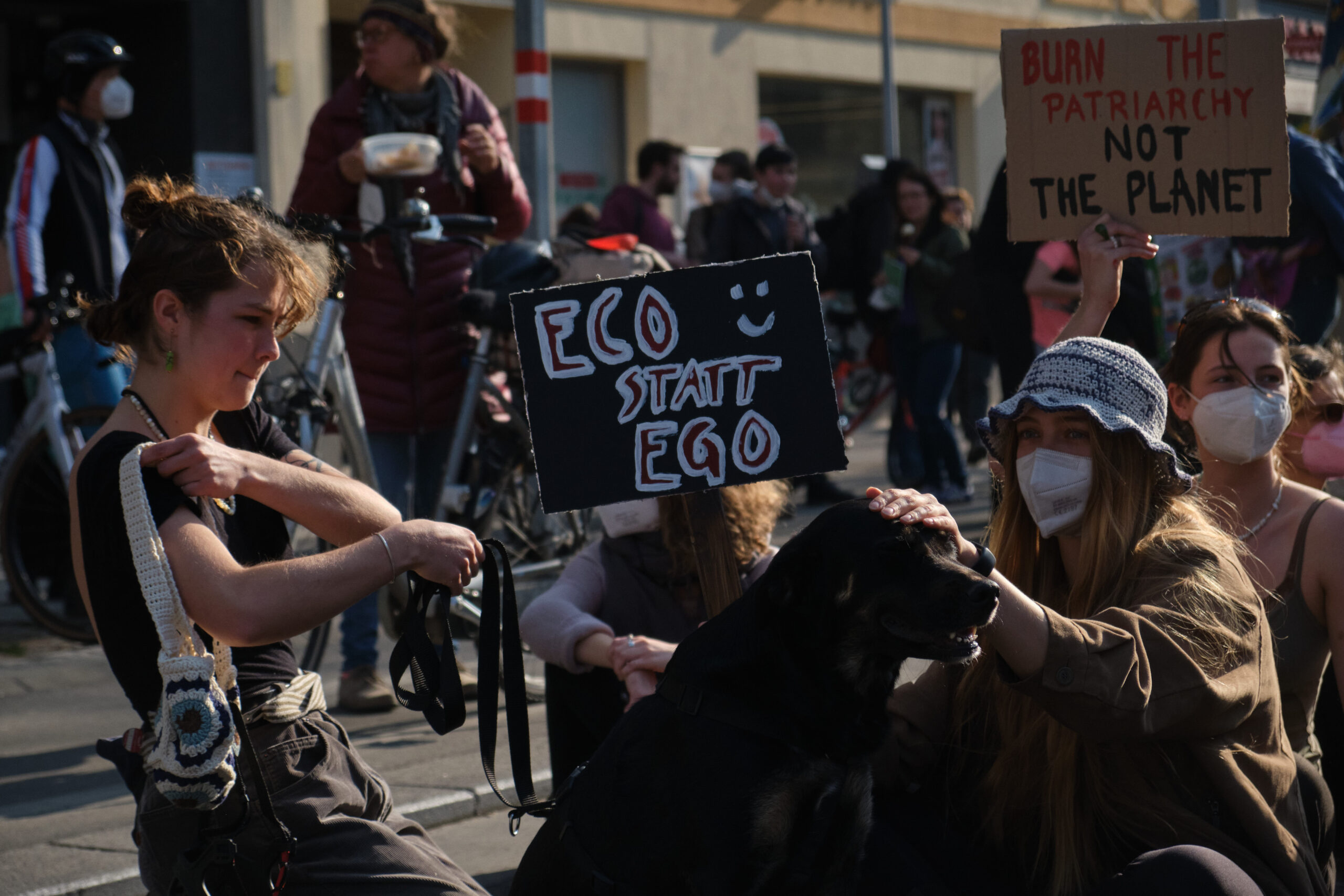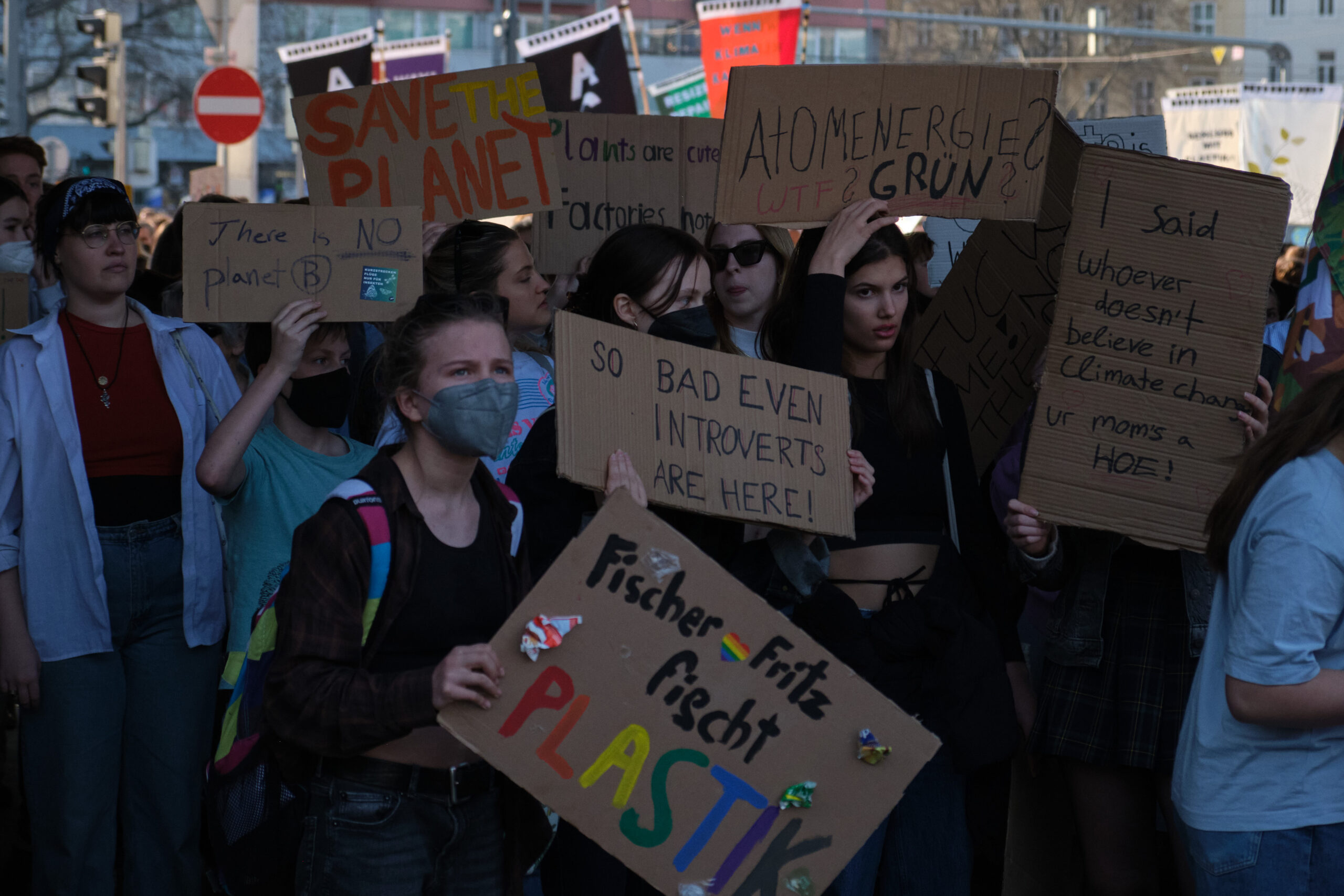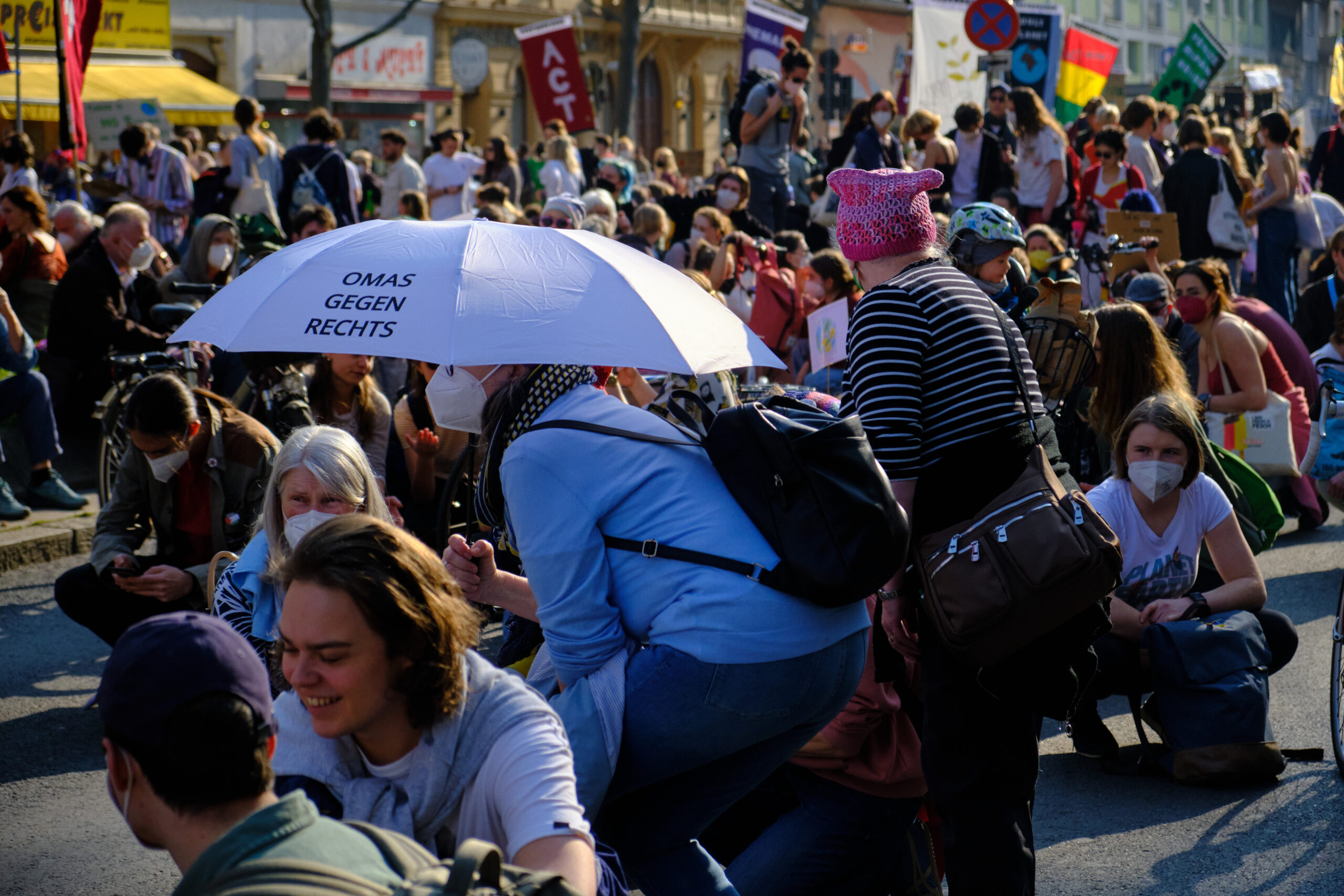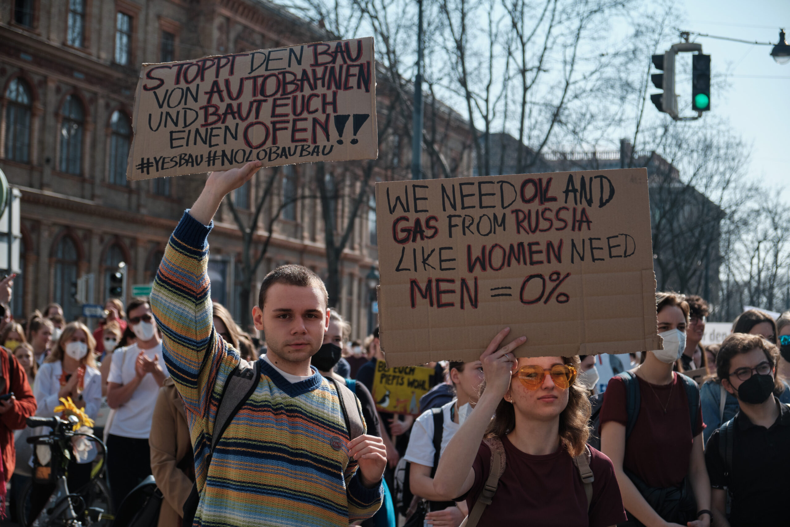 „A – Anti – Anticapitalista“ und „Hoch die internationale Solidarität“ – lautstark gibt der antikapitalistische Block die Parolen vor, angeführt vom „Jugendrat“. Vorneweg gleichzeitig ein starker Block von „Fridays for Future“. Sprechchöre gegen Ölkonzerne und die in Wien geplanten Auto-Monsterprojekte Stadtautobahn und Lobautunnel hallen über die Wiener Praterstraße.