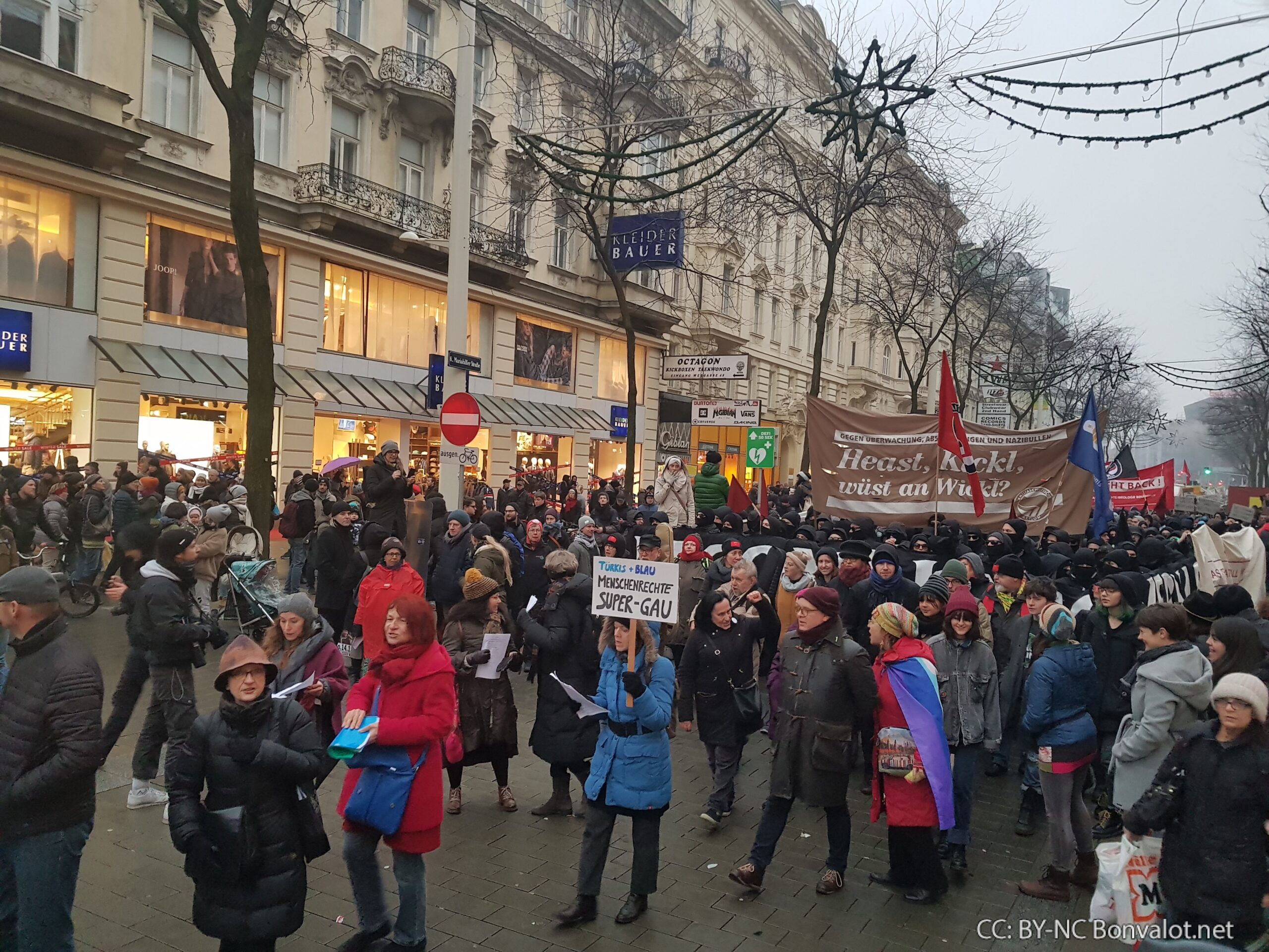 Viele Organisationen und Zusammenhänge stellten große Blöcke auf der Demo. So gab es etwa einen Internationalistischen Block, einen antirassistischen Block, eine Eltern-Kind Block, den Block der „Gewerkschafterinnen gegen Rassismus und Sozialabbau“, einen Block von Studierenden sowie den Block der Omas gegen Rechts, die sich während der Demo lautstark zu Wort meldeten. Auch aus anderen Bundesländern war Unterstützung gekommen. Allein aus Linz waren vier Busse zur Demo nach Wien angereist.
