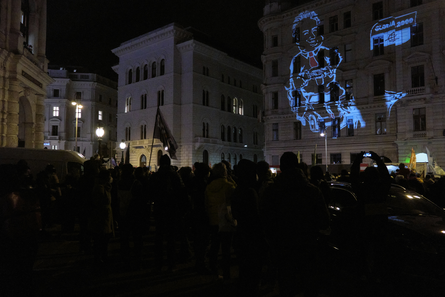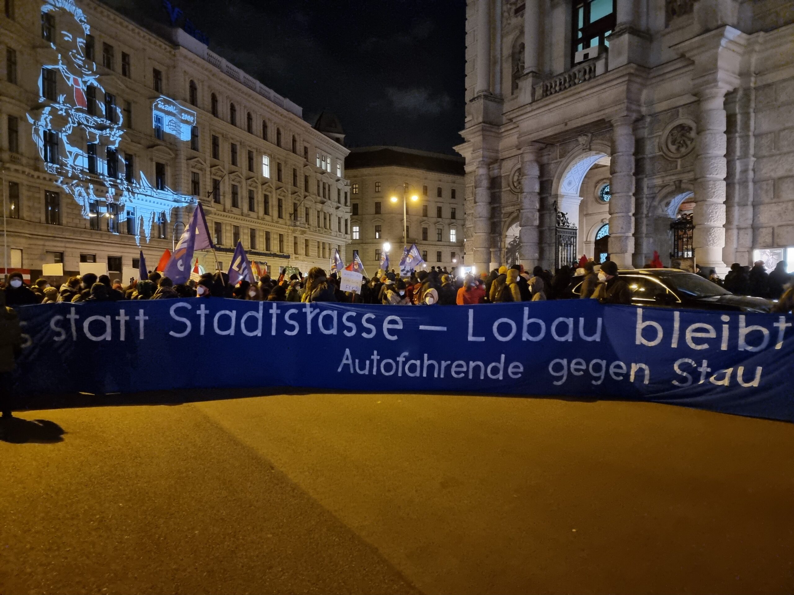 Anschließend wurde in Sprechchören der Rücktritt von Wiens SPÖ-Umweltstadträtin Ulli Sima gefordert. Im Hintergrund wurde die SPÖ-Zentrale unterdessen von einem Comic angestrahlt, wo Wiens SPÖ-Bürgermeister Michael Ludwig mit einem Auto über einen gefällten Baum fährt.