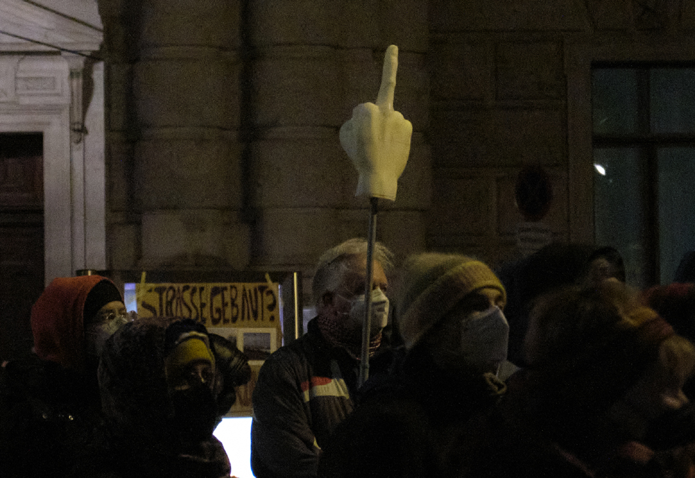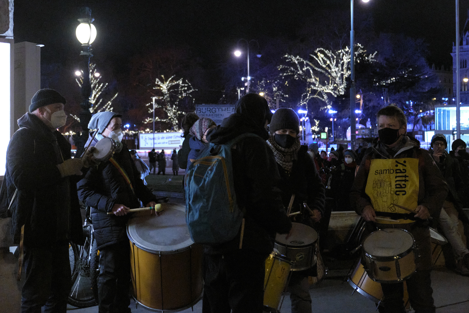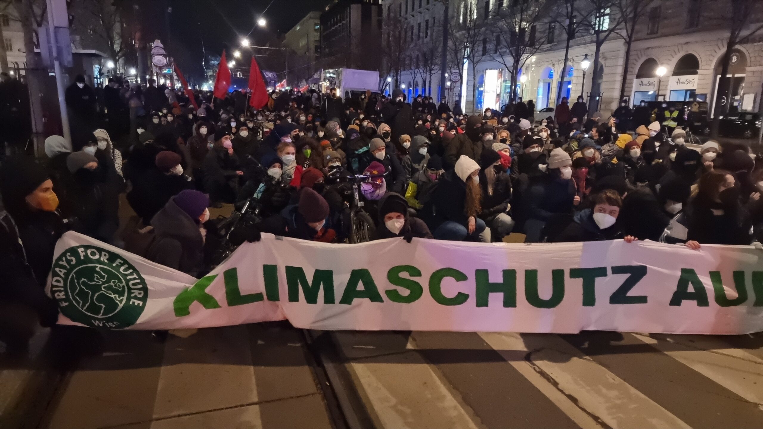 Die Kundgebung fomierte sich anschließend zu einer spontanen Demo über die Ringstraße zum Polizeianhaltezentrum (PAZ) Rossauer Lände. Bei der Räumung des Klimacamps früher am Tag hatte die Polizei insgesamt 48 Menschen verhaftet, darunter soll nach Auskunft von Aktivist*innen auch ein erst 12-jähriges Kind sein. Vor dem PAZ wurde dann lautstark die Freilassung alles Aktivist*innen gefordert.