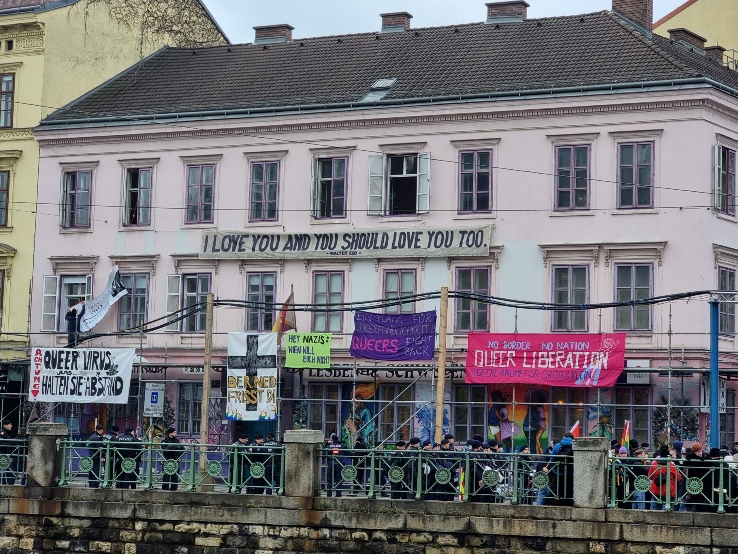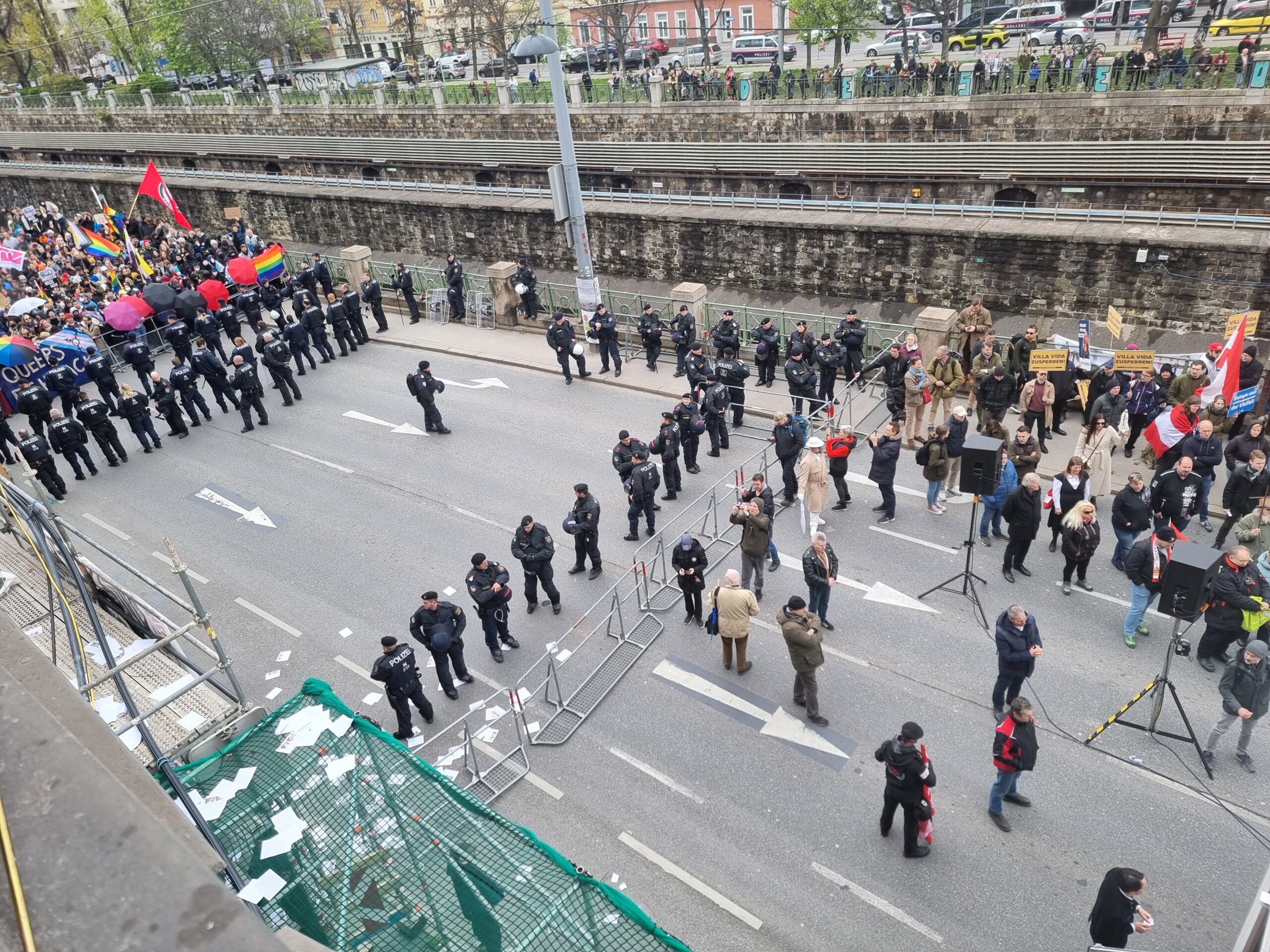 Ungeachtet der rechten Provokationen konnte die Kinderbuchlesung – übrigens vor vollem Haus und mit zahlreichen Kindern – dann tatsächlich ungestört über die Bühne gehen. Geschuldet war das allerdings wohl weniger der Strategie der Wiener Polizei, sondern vor allem den zahlreichen solidarischen Menschen. Sie hatten mit ihren Körpern und ihren Kundgebungen verhindert, dass sich die Rechten in der Gegend rund um die Villa breitmachen konnten und stattdessen durchgehend eingezäunt waren. Nach dem Ende der rechten Standkundgebung marschierten die einschlägigen Teilnehmerinnen dann über die Rechte Wienzeile zur Ringstraße. Und auch darüber wird noch zu sprechen sein: