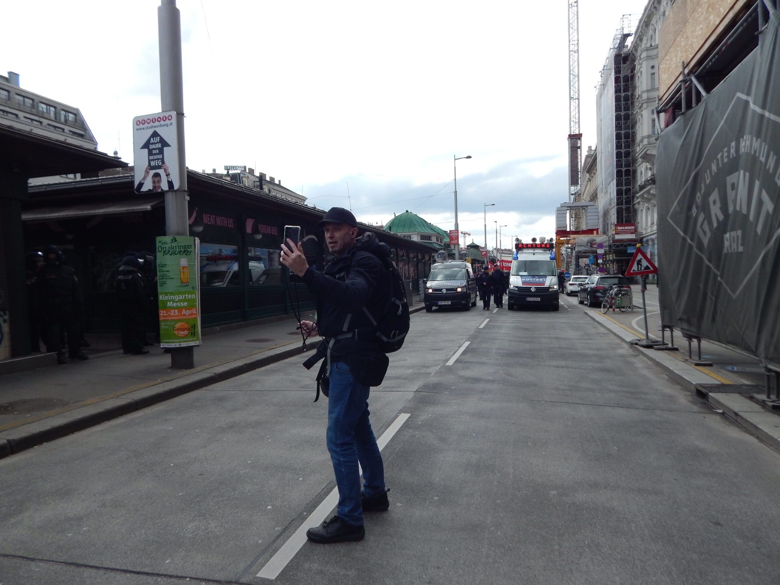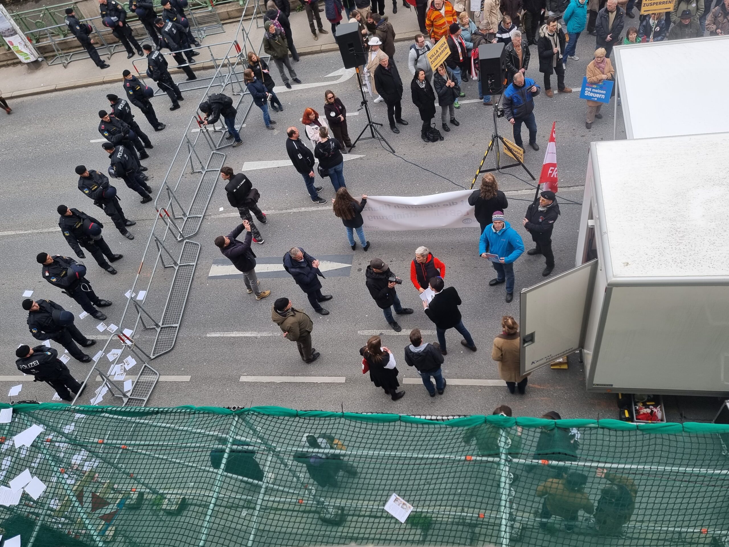 Denn noch am Freitag hatte die Landespolizeidirektion Wien eine Auflistung aller angezeigten Kundgebungen und Demonstrationen bekanntgegeben. Ein Aufmarsch von der Villa zur Ringstraße war nicht dabei. Konnten die Rechten also ohne jede Anzeige/Anmeldung einer Demonstration Richtung Wiener Innenstadt marschieren? Rechtlich könnte das noch bedeutsam werden.