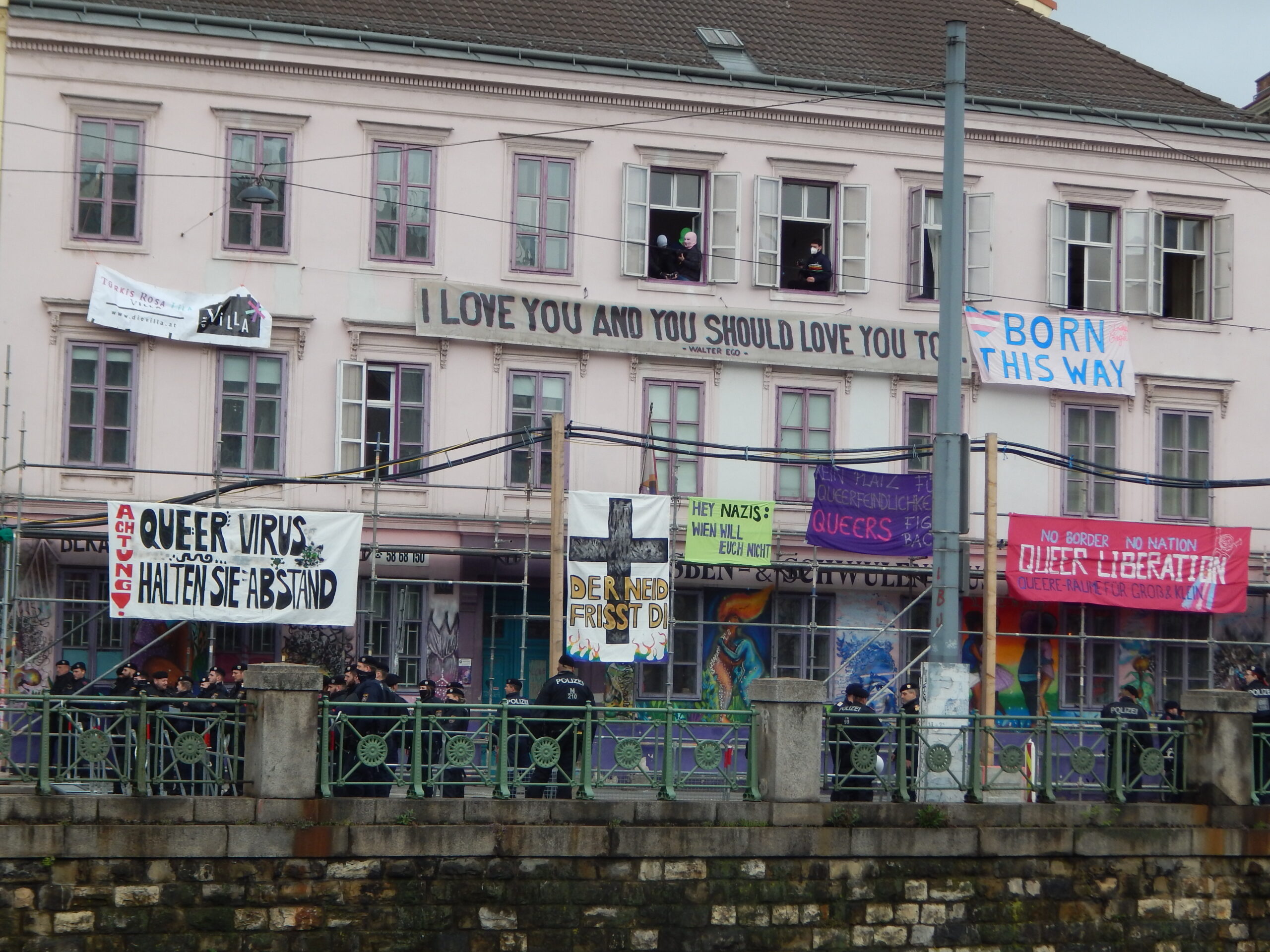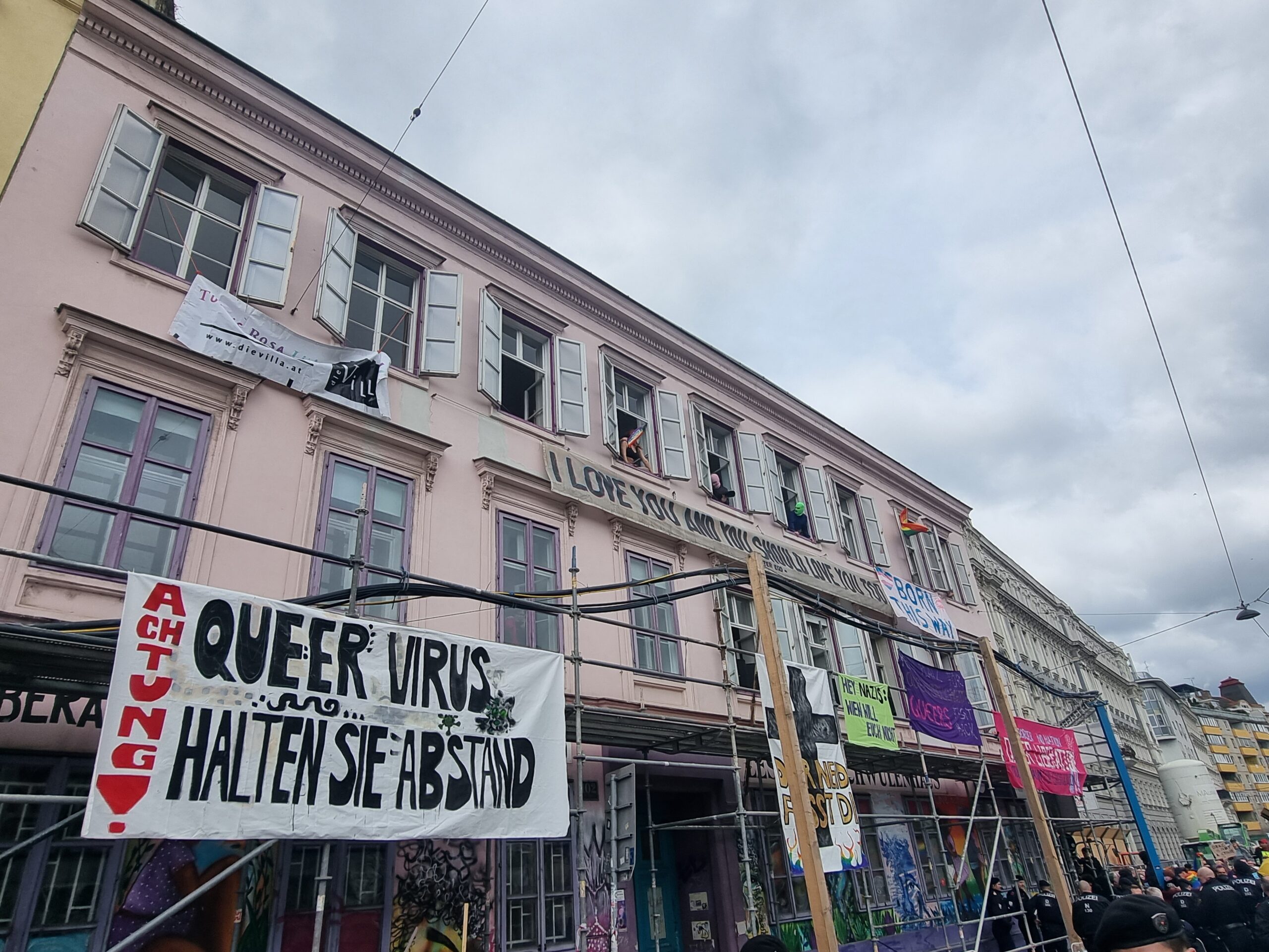 Direkt vor die Villa sind die Rechten durch den Protest somit nicht gekommen: Beide Eingänge zum Wiener Zentrum der LGBTI-Community waren zugänglich, die Polizeiabsperrung begann direkt an der Grenze zum Nebenhaus. Ungeachtet dessen wird über die Strategie der Polizei noch zu sprechen sein. Denn die Rechten wurden von der Polizei dennoch fast direkt vor die Villa gelassen. Wenn Eltern mit ihren Kindern am Weg zur Lesung in den Marsch hineingelaufen wären, hätte das enorm gefährlich werden können. Vor allem auch deshalb, weil der Marsch genau zwischen der Villa und der nur wenige Meter entfernten U-Bahn Station Pilgramgasse positioniert wurde. Und dass die Szene gewalttätig ist, hatte sich bereits im Vorfeld gezeigt. Mobilisiert wurde etwa auf den Telegram-Kanälen von Corona-Gesicht Martin Rutter und Identitären-Gesicht Martin Sellner.
