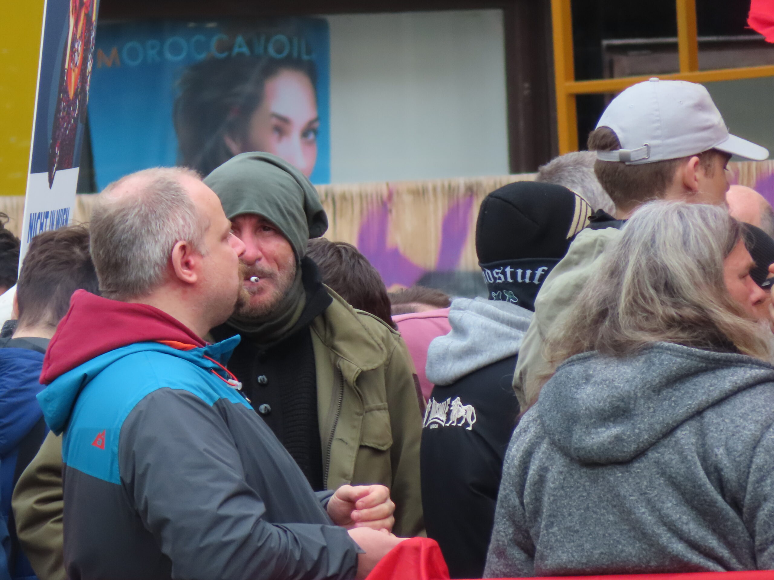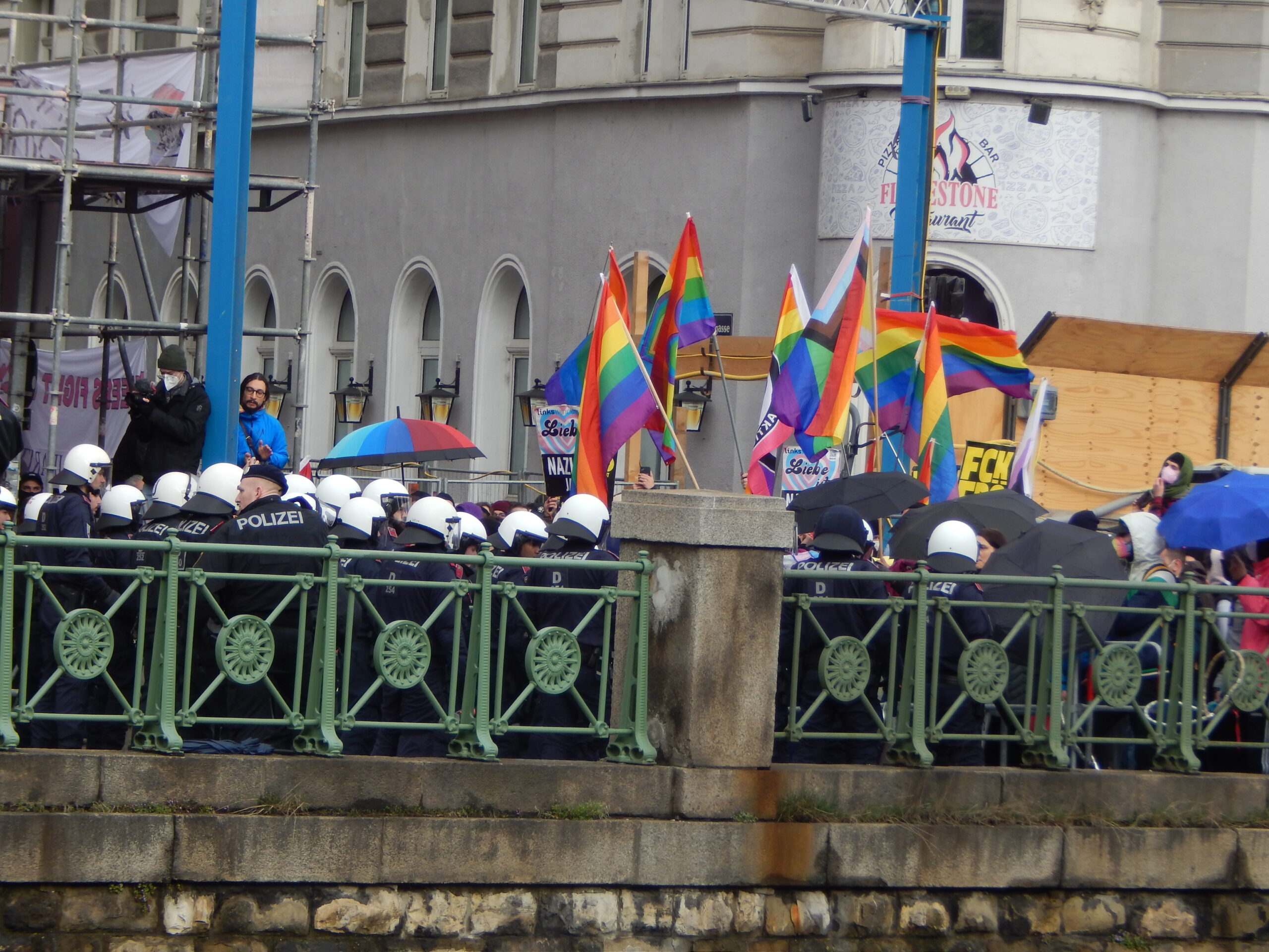 Denn als sich die Rechten in Bewegung setzten, begannen auch linke und queere Proteste an den Straßenrändern. Beteiligt daran waren nicht nur Menschen, die vorher an der Solidaritätskundgebung teilgenommen hatten. Ich selbst habe etwa Besucher:innen von Lokalen gesehen, die den Rechten den Mittelfinger entgegenstreckten und lautstark „Nazis raus“ riefen. Die Polizei aber schützte den rechten Aufmarsch und räumte in mindestens einem Fall auf Höhe U4 Kettenbrückengasse auch eine linke Blockade ab. Vor allem, wenn der rechte Aufmarsch nicht einmal angezeigt gewesen wäre, wäre das rechtlich mehr als zweifelhaft.