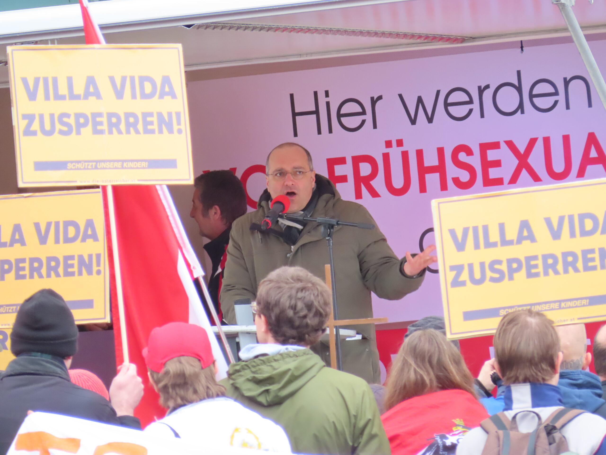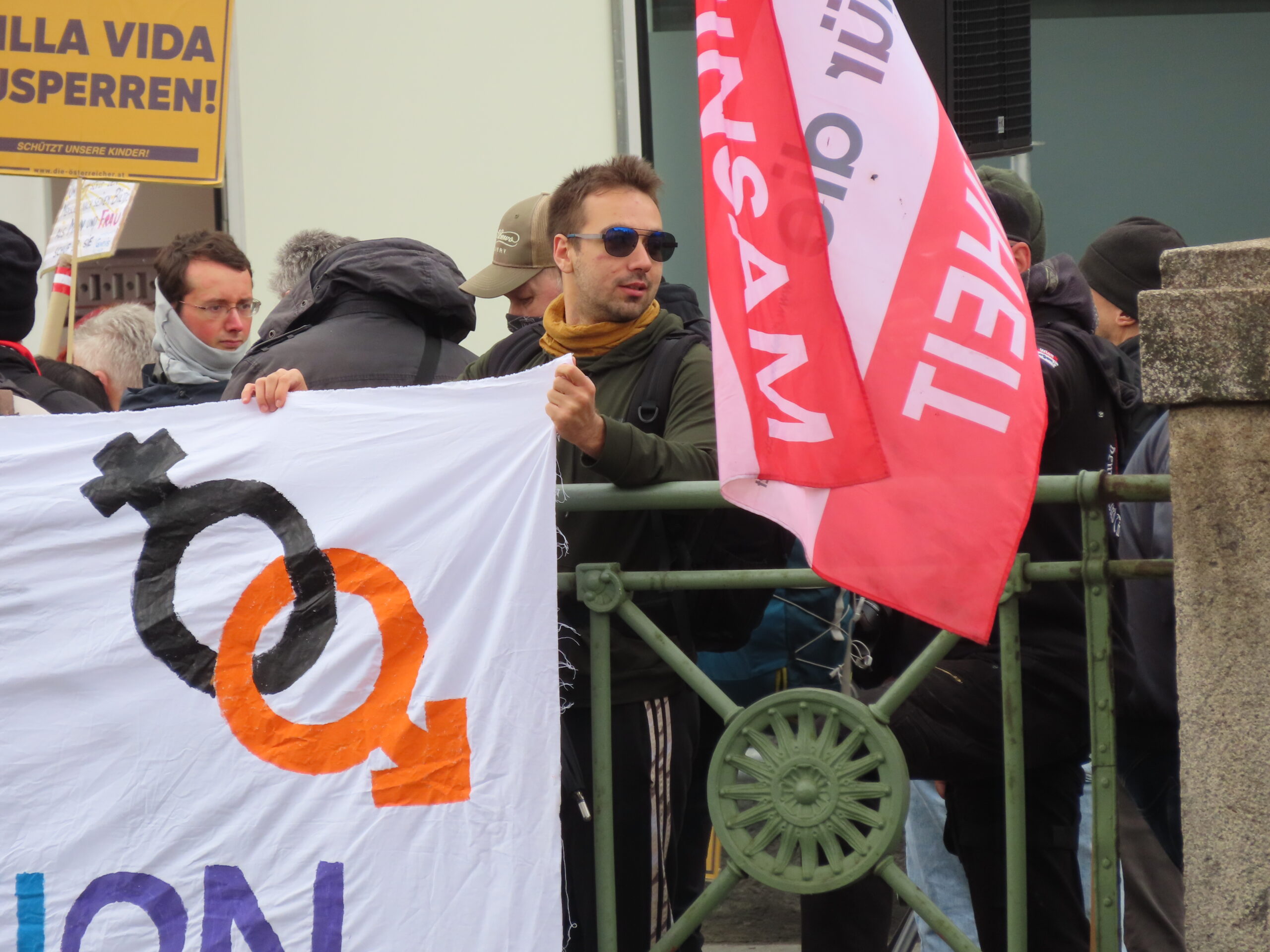 Nur rund 300 Personen sind am Sonntag beim rechten Aufmarsch vor der Türkis-Rosa-Lila-Villa erschienen. Dort wollten die Rechten gegen eine Kinderbuchlesung marschieren. Die geringe Teilnehmer:innenzahl ist eine krachende Niederlage für die Organisator:innen – vor allem wenn bedacht wird, wer da aller mobilisiert hat: Teile der FPÖ, die extrem rechte Corona-Szene, die neofaschistische Gruppe Identitäre, katholische Fundamentalisten und sogar ein kleines Grüppchen offener Austrofaschist:innen mit Flugblättern für „Kamerad Dollfuß“ – also den ehemaligen österreichischen Dikator und Arbeiter:innenmörder. Dazu sind freundliche Artikel etwa auf der rechten und ÖVP-nahen Plattform Exxpress erschienen (die Mediengruppe kassiert in Österreich durch die Medienförderung Steuergeld).