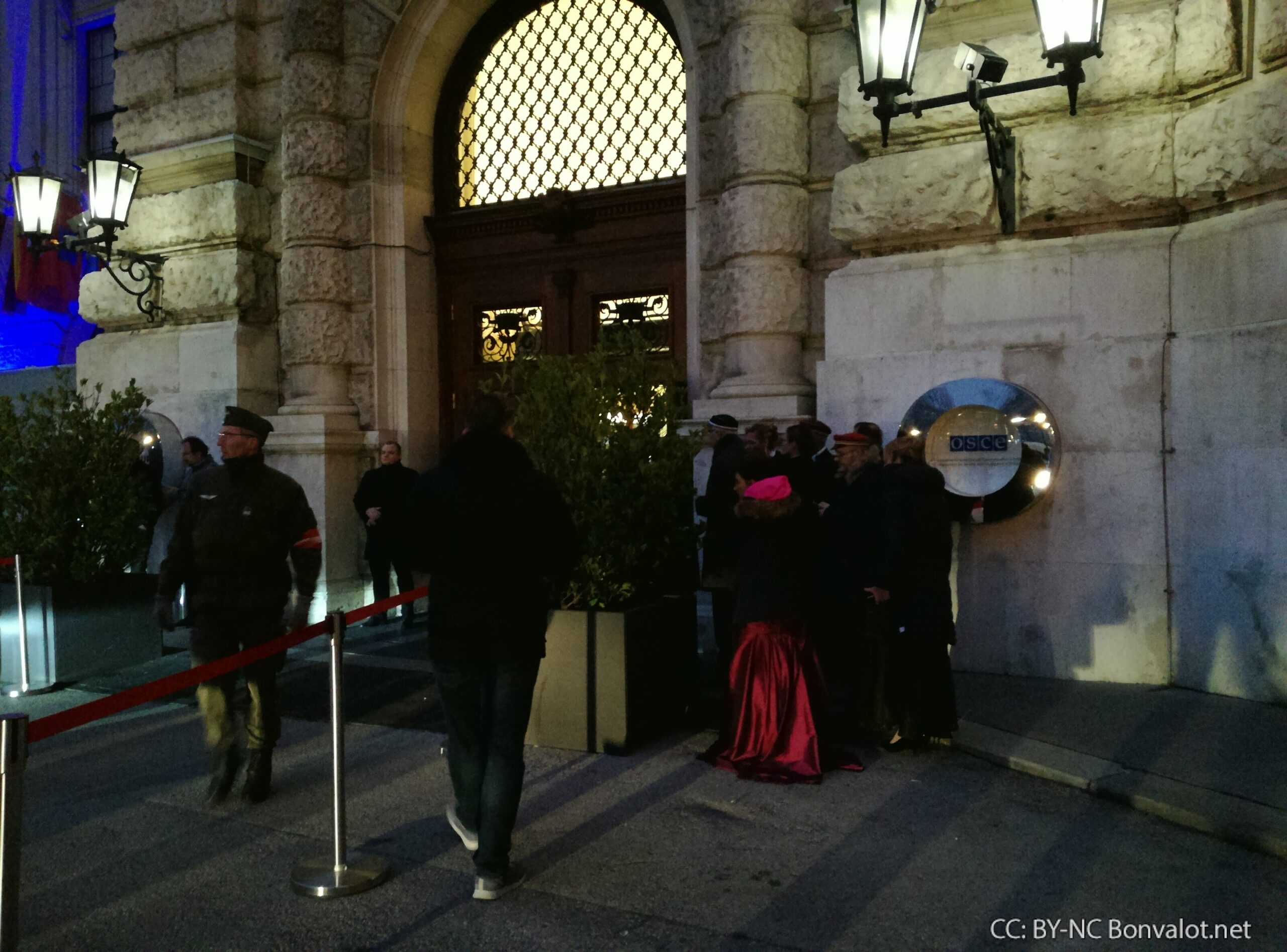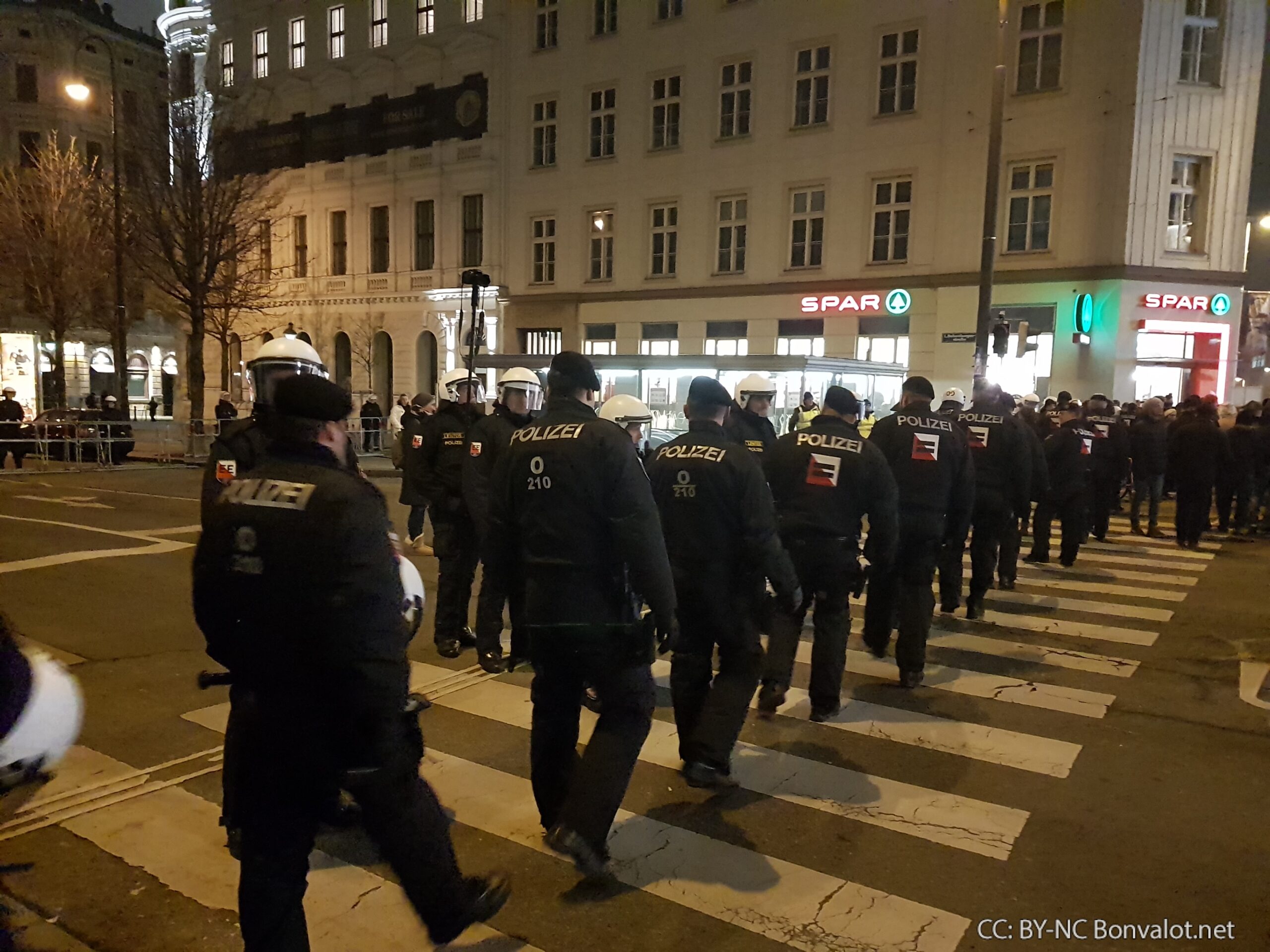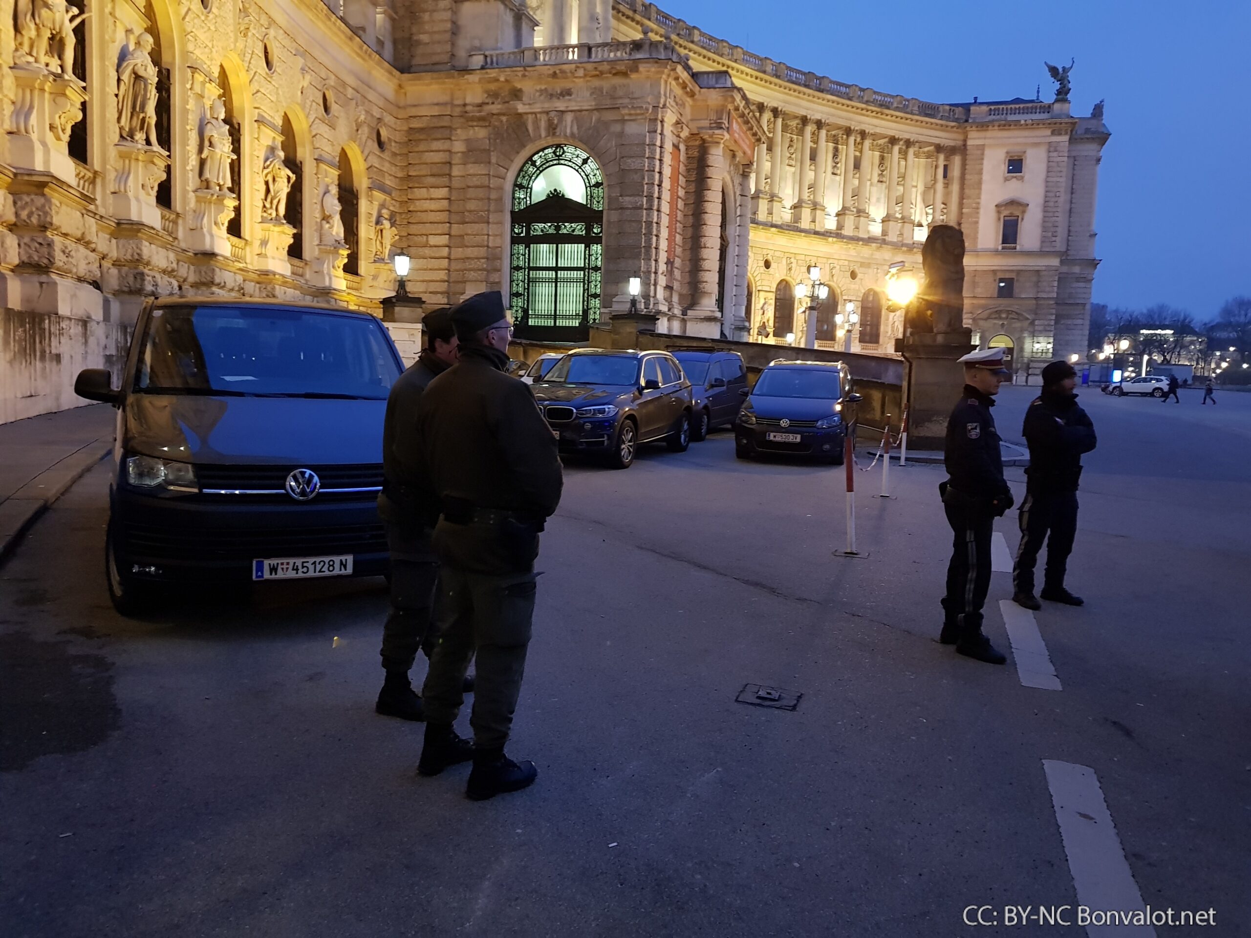 Ebenfalls auffällig war, dass auch Soldaten vor der Hofburg stationiert worden waren. Diese waren dort offiziell zur Bewachung der „Organisation für Sicherheit und Zusammenarbeit in Europa (OSZE) abgestellt, doch auf meine Nachfrage erklärten sie, dass sie „heute für beides“ zuständig sein. Damit verschwimmen die Grenzen zwischen Polizei und Bundesheer immer mehr, wie ich auch kürzlich in einem Artikel für VICE ausführlich beschrieben habe.