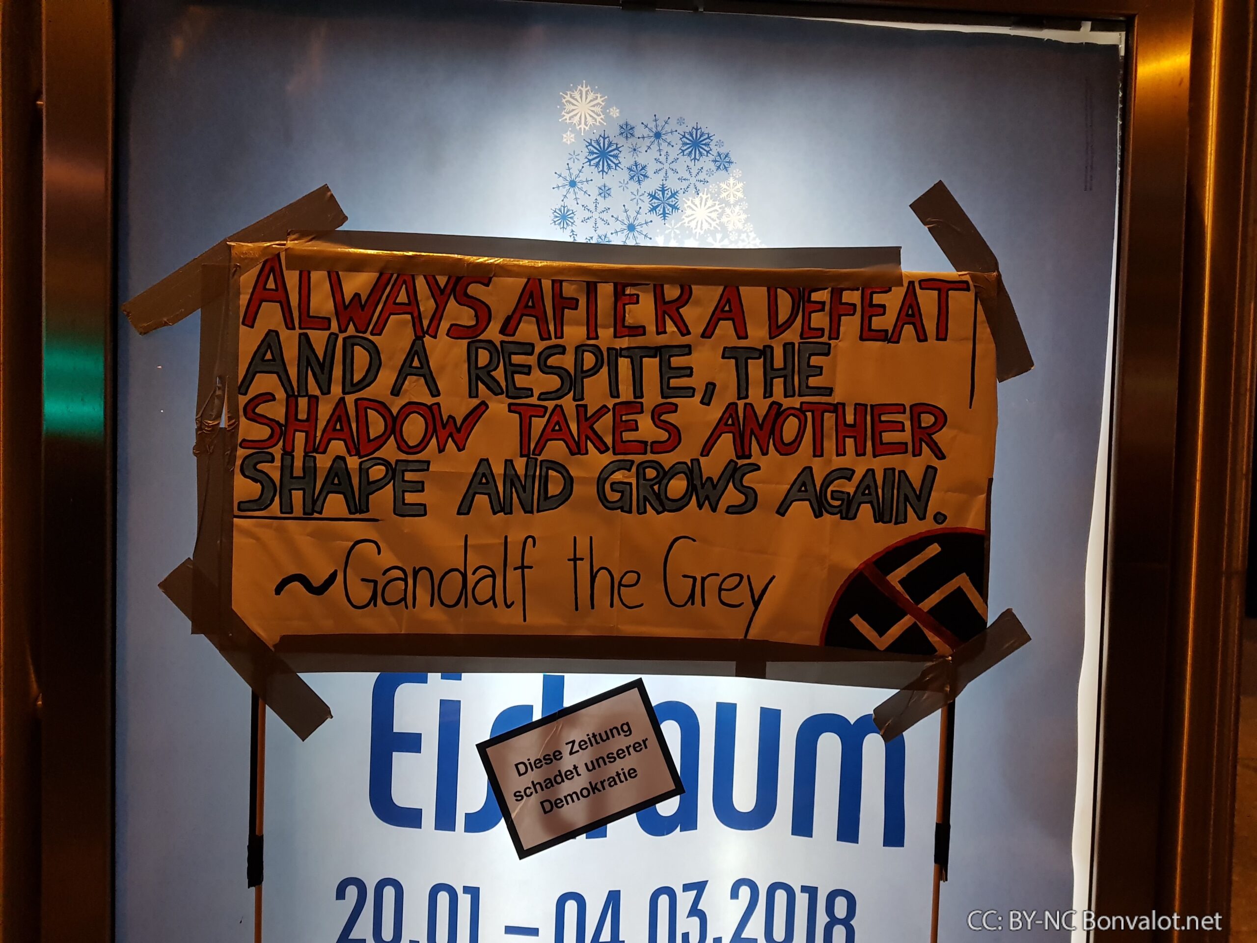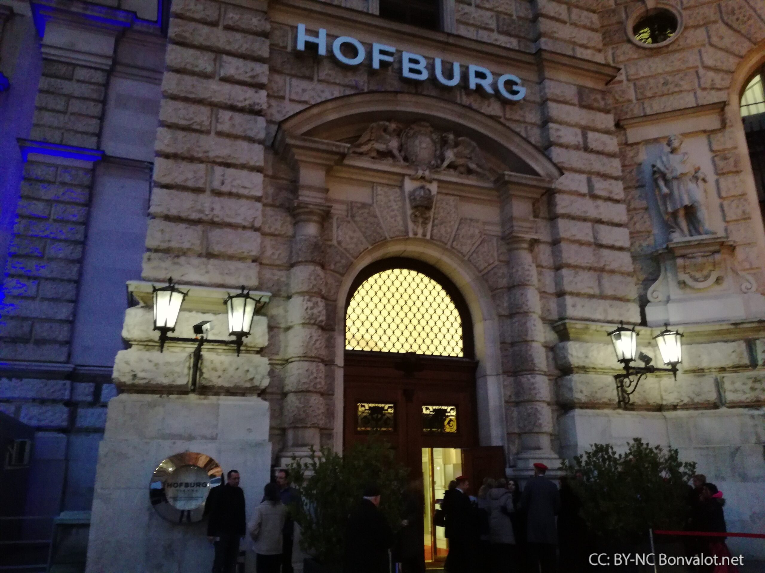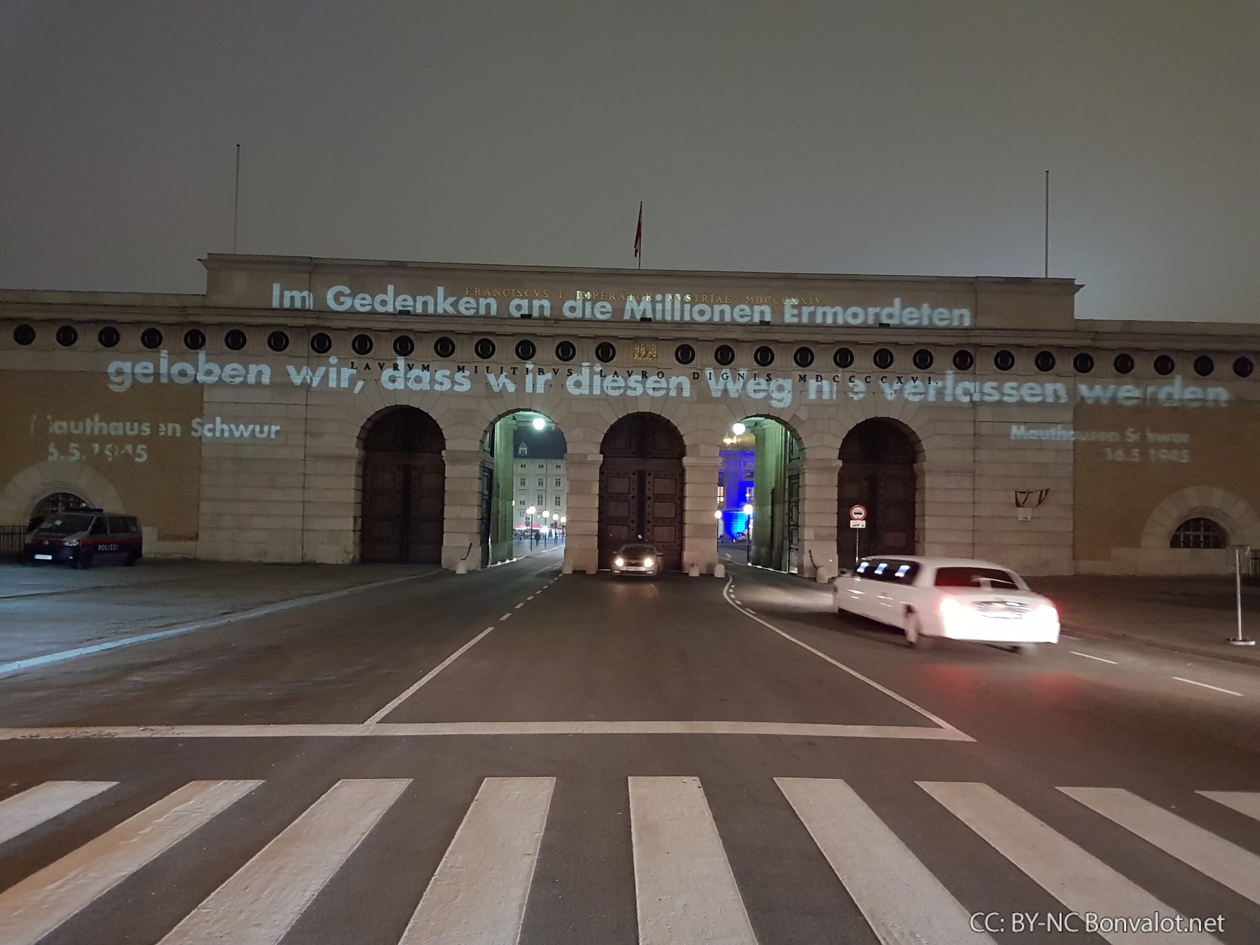 Das Heldentor, also der Eingang zur Hofburg wurde in diesem Jahr mit übergroßen Losungen angestrahlt. So mussten es war die Burschenschafter auf ihrem Weg in die Hofburg, wo sie teilweise mit Luxus-Karrossen an fuhren, unter anderem den Mauthausen-Schwur passieren: „In Gedanken an Millionen Ermordete geloben wir, dass wir diesen Weg nie verlassen werden“.