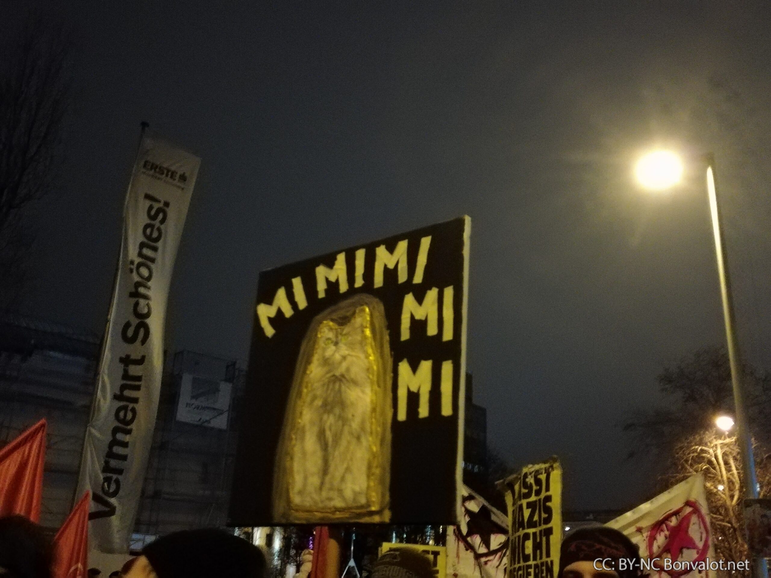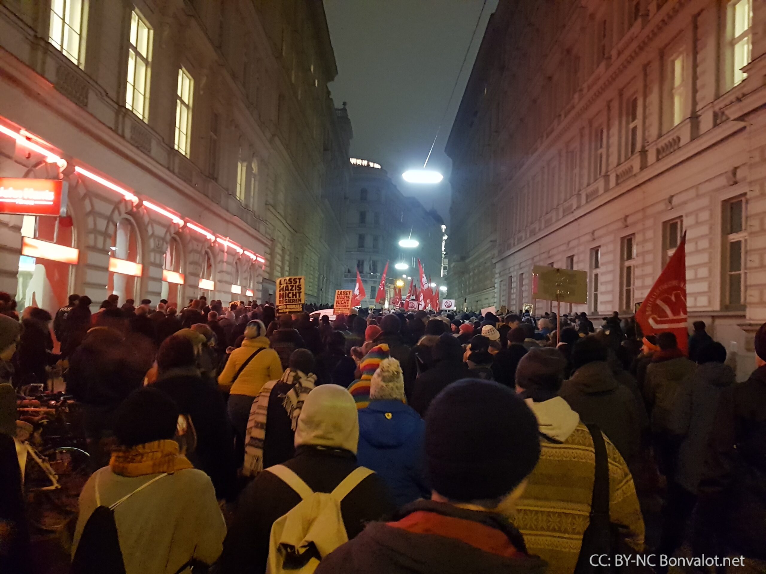 Im weiteren Verlauf der Demonstration erhöhte die Polizei ihre Schätzung auf 7500-8000 TeilnehmerInnen, ich würde ebenfalls von einem weiteren Zustrom ausgehen. Die Wiener Polizei hat damit eine ungewohnt korrekte Einschätzung abgegeben. Die Polizei hielt sich heuer ungewohnt zurück und verzichtete etwa weitgehend auf martialisches Auftreten mit Helmen oder enge Spaliere. Auf der Demonstration herrschte gute Stimmung, viele hatten selbstgemachte Schilder und Transparente mitgebracht. Besonders oft ertönte der Slogan „Hoch die internationale Solidarität“.