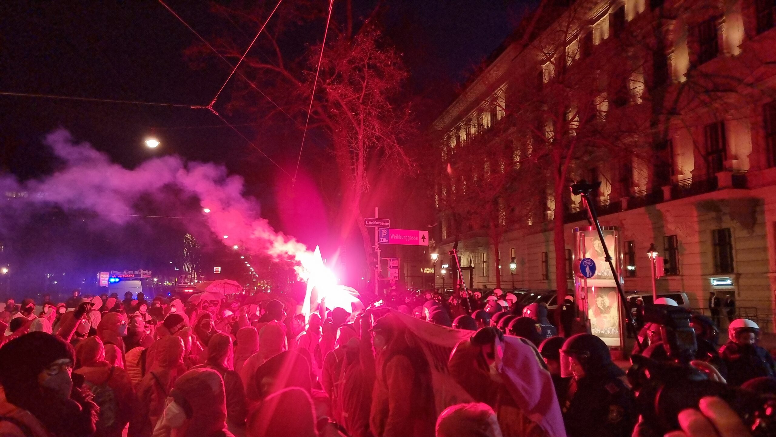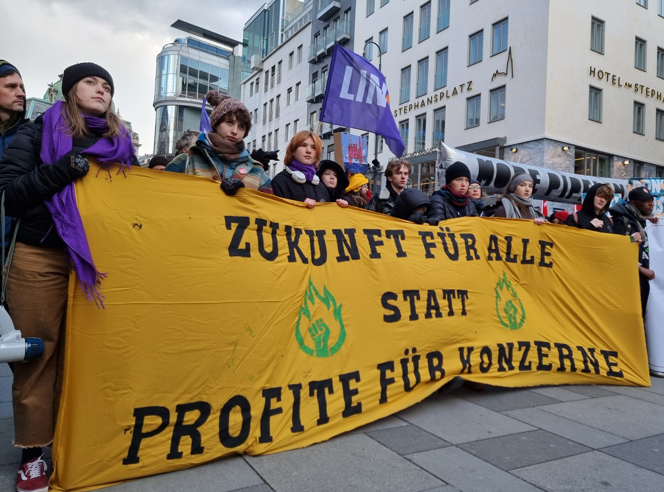 Ab der Rotenturmstraße wurden die Demo nochmals durch rund 300 Menschen verstärkt. Diese Aktivist:innen hatten seit dem Morgen die OMV-Raffinerie in Schwechat bei Wien blockiert. Hier haben wir für euch die Bilder des ersten Protest-Tags in der Wiener Innenstadt und der Blockade der OMV.