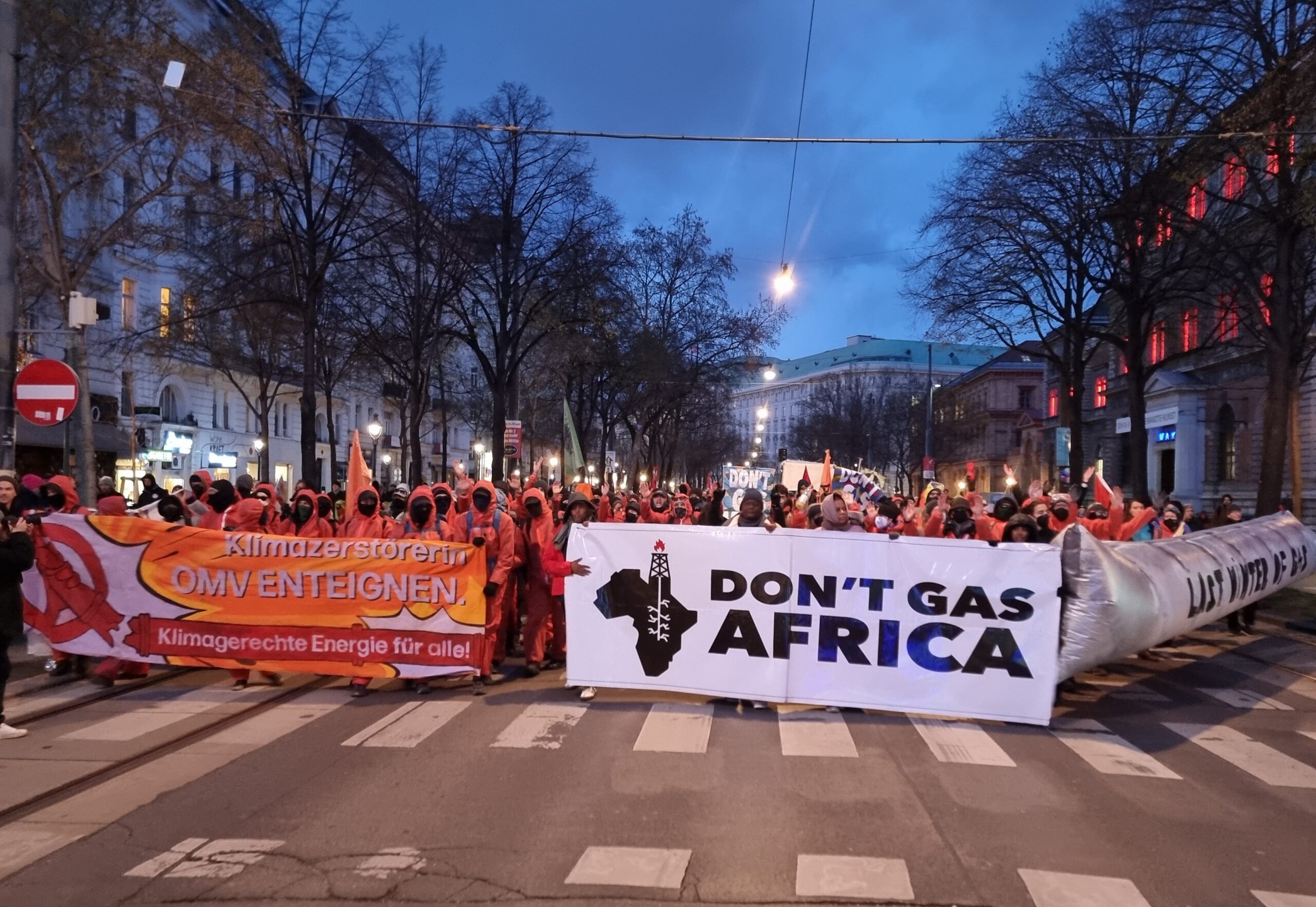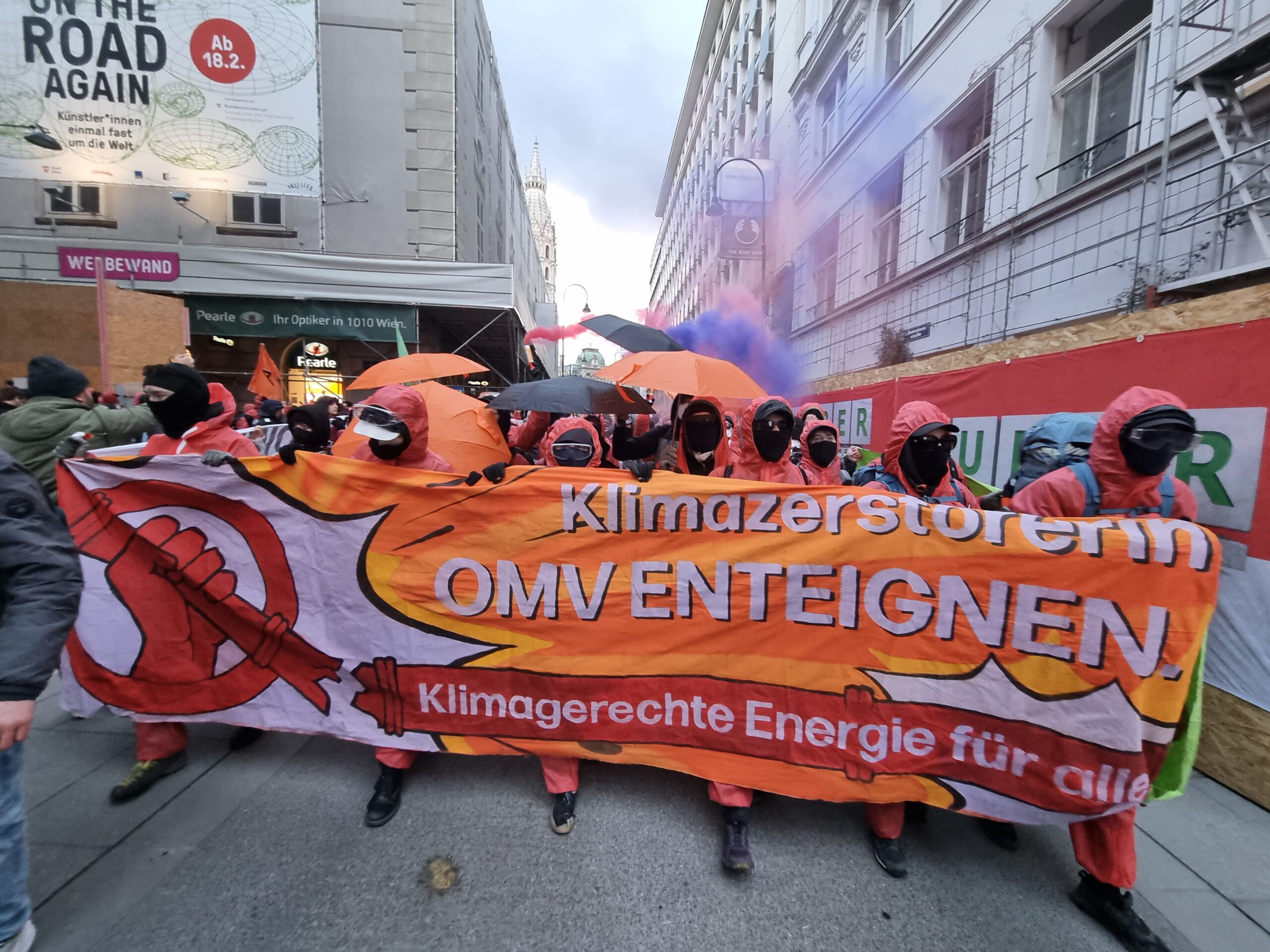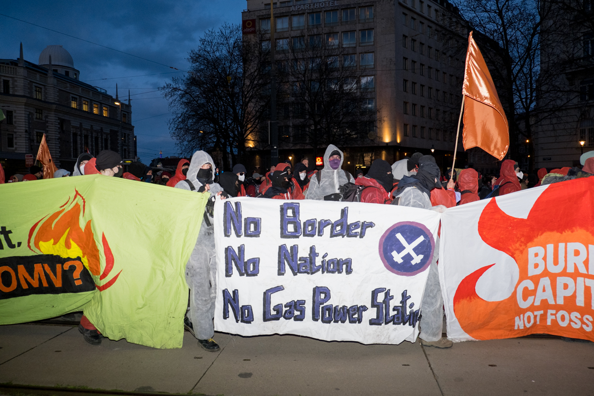 Nach einer Auftaktkundgebung am Stephansplatz zog die Demonstration mit lauten Sprechchören wie „A – Anti – Anticapitalista“ oder „Hoch die internationale Solidarität“ über die Rotenturmstraße und die Ringstraße zum Karlsplatz. Besonders im Augenmerk der Demonstrant:innen: Der österreichische Energie-Konzern OMV, der auch Co-Gastgeber der Energiekonferenz ist. Mit Sprechchören wurde immer wieder die Enteignung der OMV gefordert.