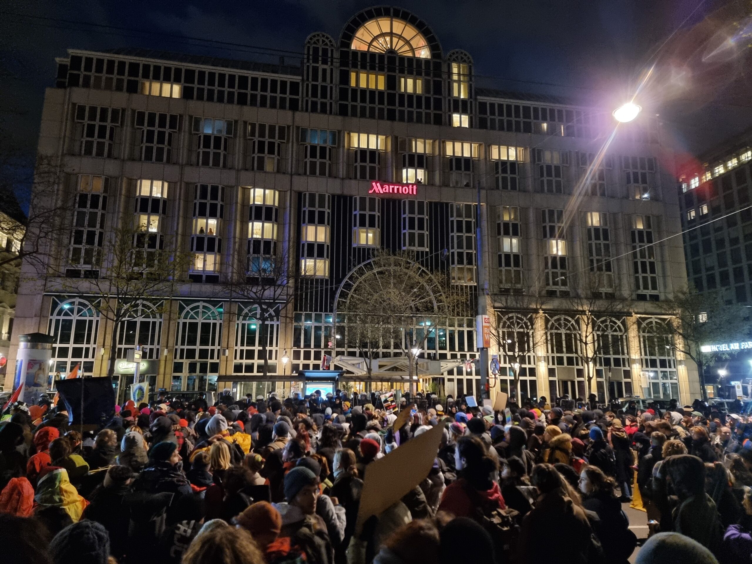 Besonders laut wurde die Demonstration, als sie direkt vor dem Hotel Marriot auf der Ringstraße eintraf, dem Tagungsort der Konferenz. Die Polizei hatte dort bereits enorm starke Kräfte zusammengezogen.