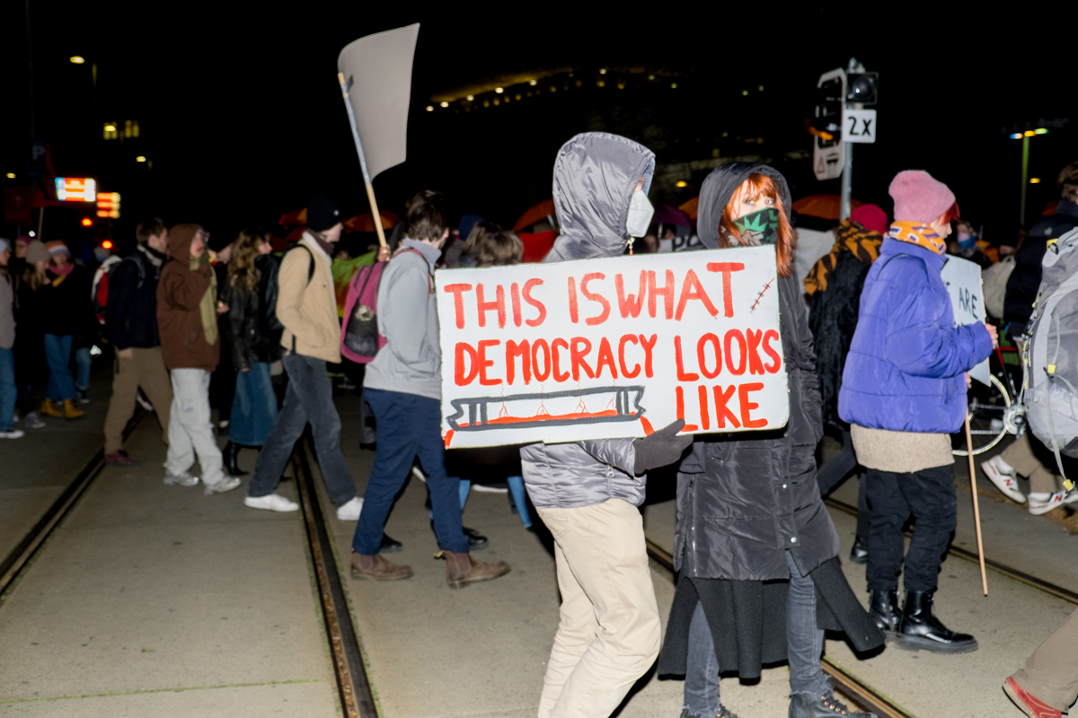 Aus der Demonstration wurden als Reaktion auf dieses Aufgebot zahlreiche polizeikritische Parolen angestimmt. Nach einer längeren Zwischenkundgebung vor dem Hotel, unter anderem mit einer Rednerin von Fridays for Future aus Polen, zog die Demonstration schließlich zur Abschlusskundgebung am Karlsplatz.
