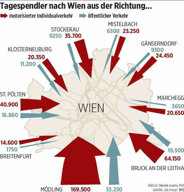 Und die Zahlen sprechen für sich: 170.000 tägliche Auto-PendlerInnen aus dem Korridor Mödling, dazu nochmals 64.000 im Süden aus Bruck/Leitha, fast 36.000 aus Stockerau, 41.000 aus St. Pölten. Aus allen Korridoren zeigt sich das gleiche Bild: der überwiegende Teil fährt mit dem Auto, nur eine Minderheit benützt die Öffis.
