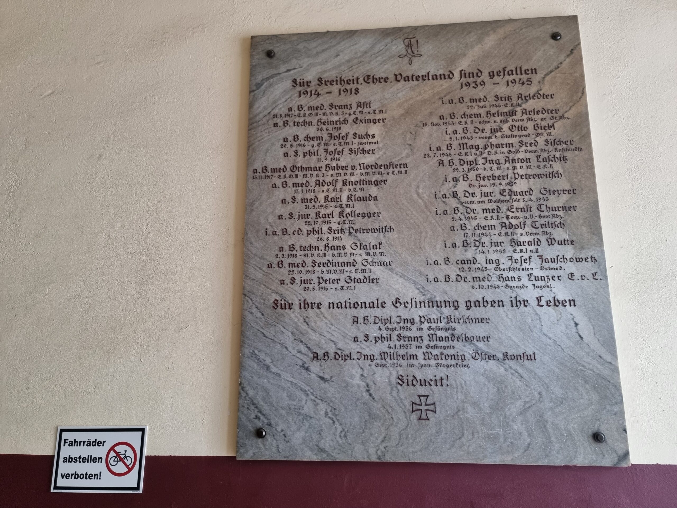 Der Eingangsbereich des Verbindungshauses der Burschenschaft Allemannia. Eine Gedenktafel für Burschenschafter, die „für ihre nationale Gesinnung“ gestorben wären. Bild: Michael Bonvalot