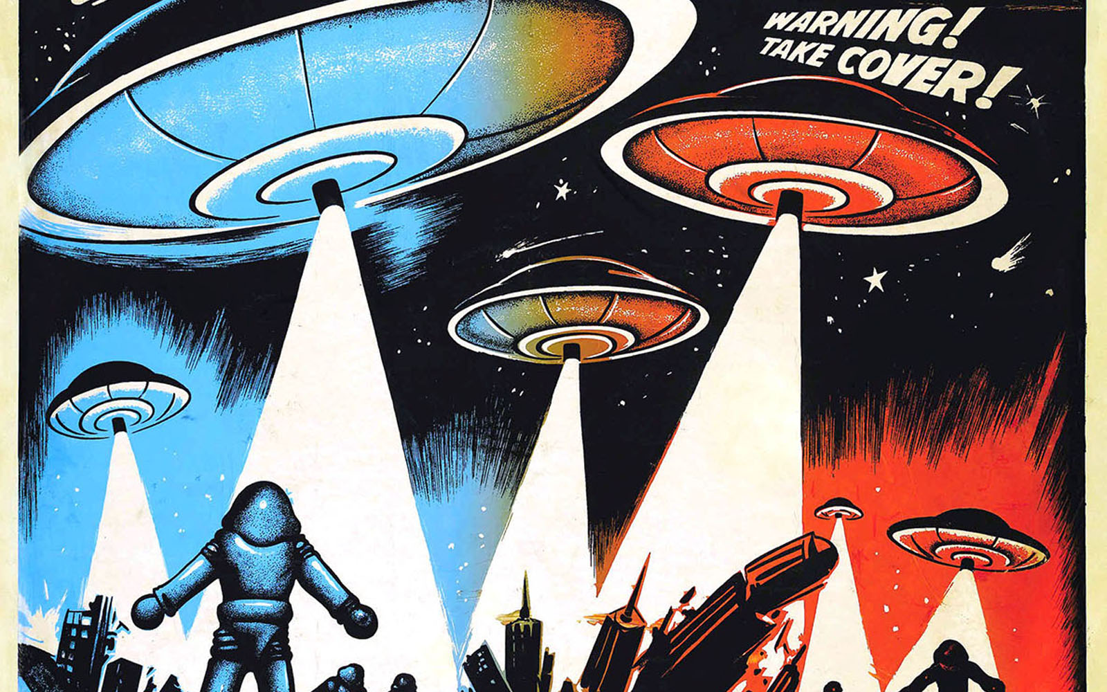 Titelbild: Filmplakat des Science-Fiction-Films „Erde gegen die fliegenden Untertassen“ aus den 1950er Jahren. Bild: Nationales Museum der US Air Force.