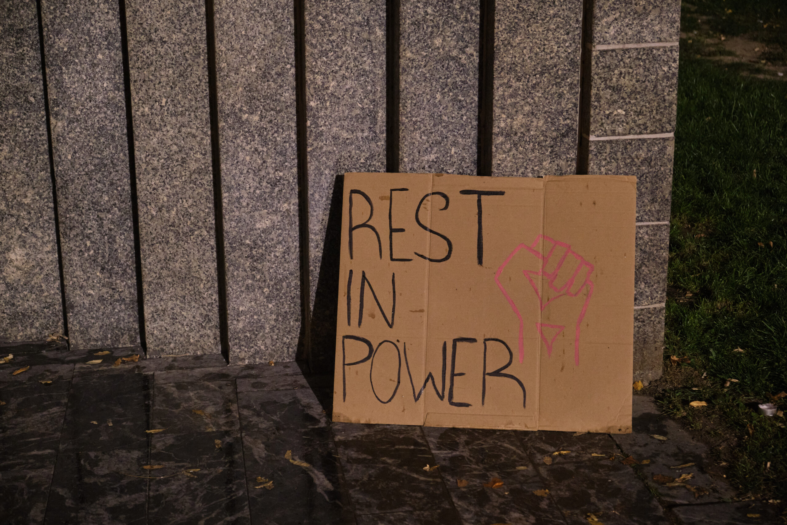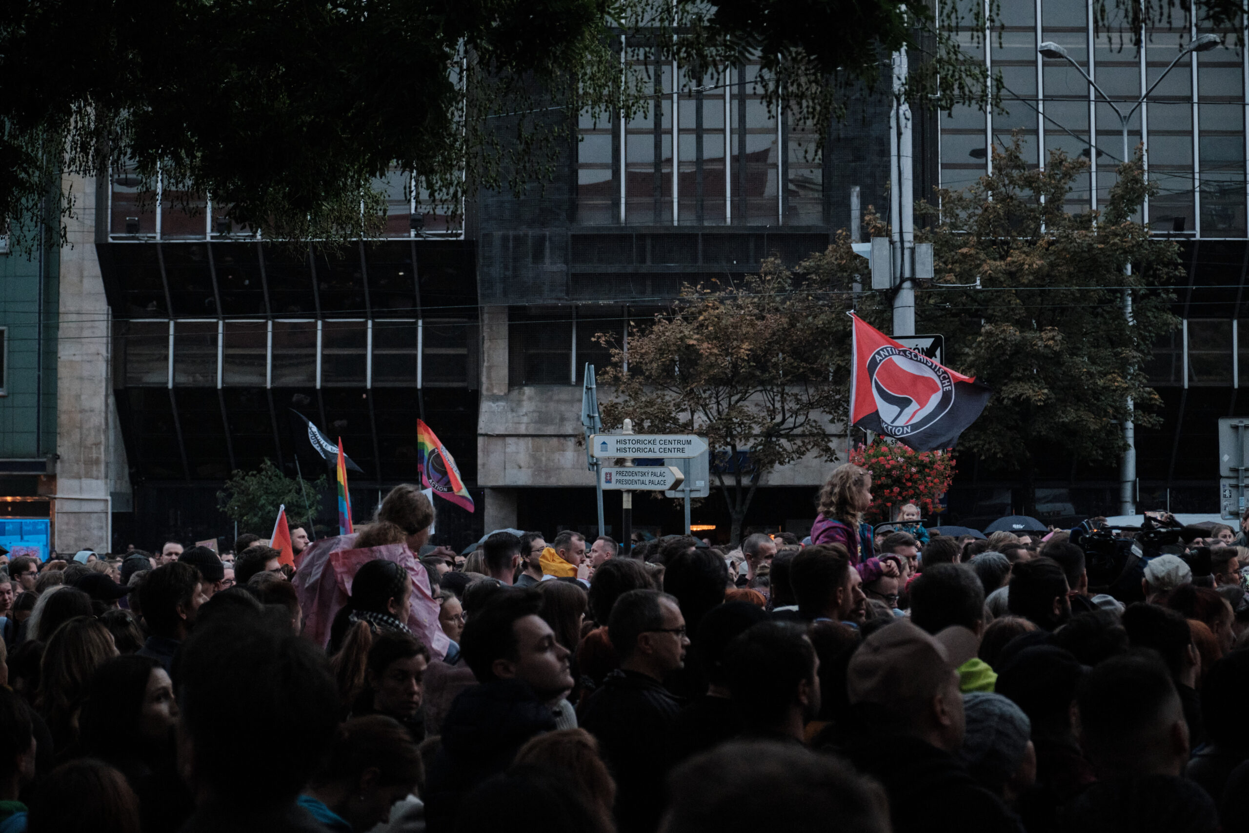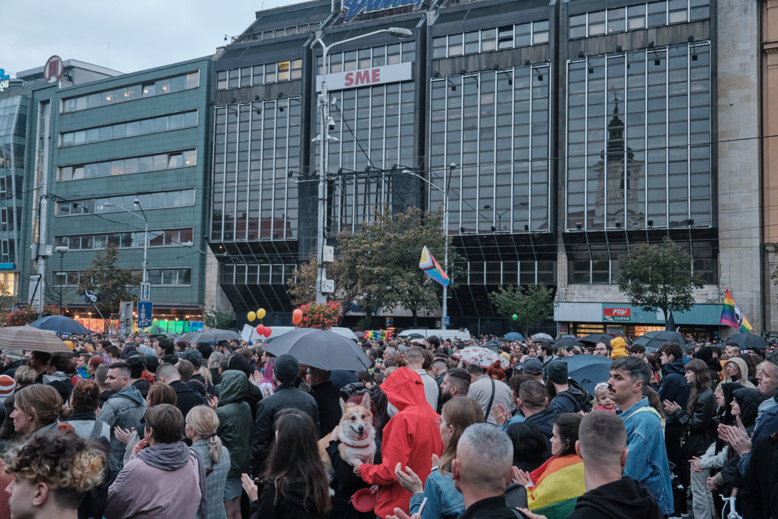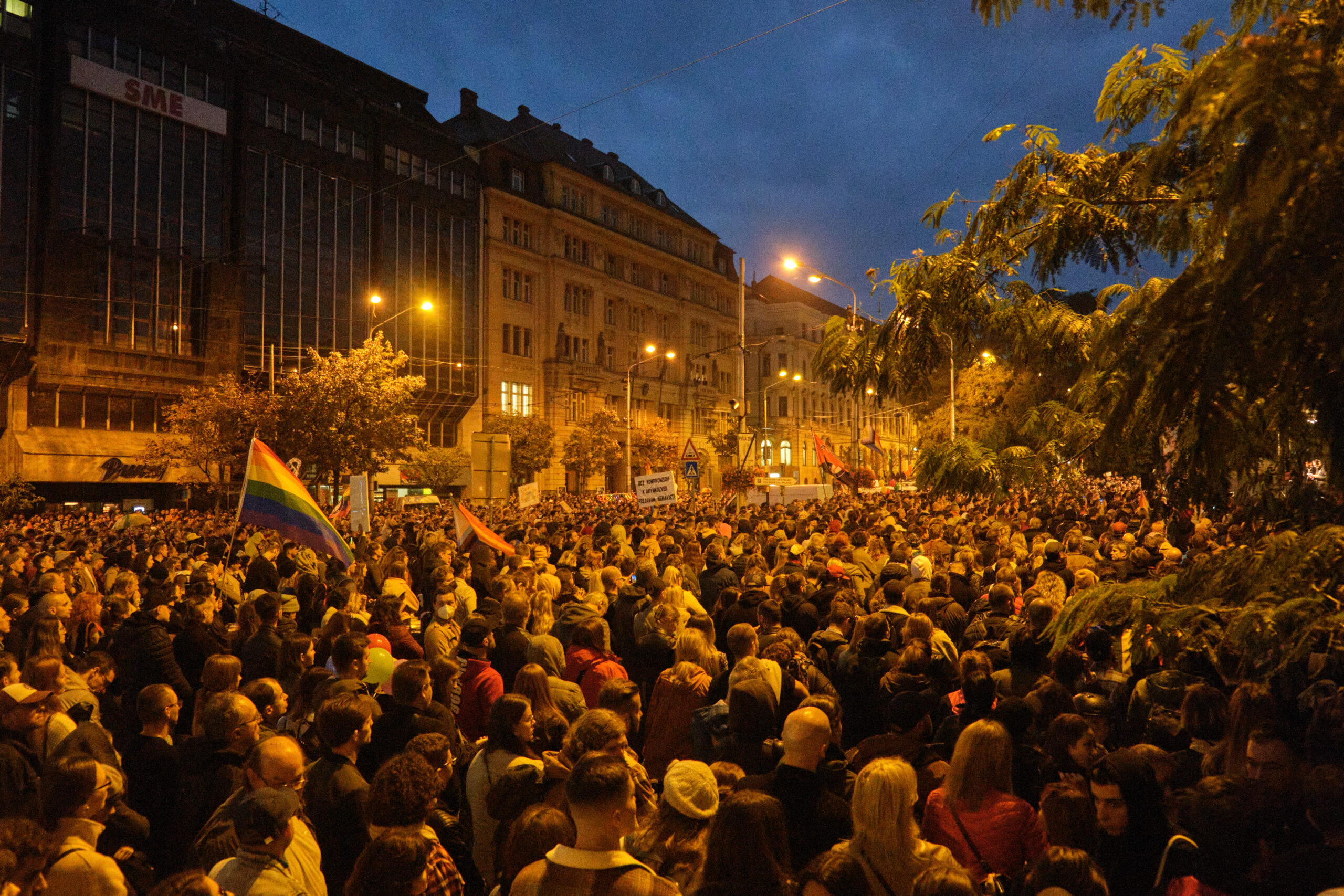 Wie viele Menschen sich am Námestie SNP-Platz versammeln, ist schwer zu sagen, der Platz ist dicht gefüllt. Laut dem Nachtbürgermeister von Bratislava sind 12.000 bis 15.000 Menschen gekommen. Immer wieder setzt Regen sein, doch die Menschen bleiben. Fahnen mit dem Regenbogen und Antifa-Fahnen wehen über der Menge. Zwischen den Reden traurige Musik.