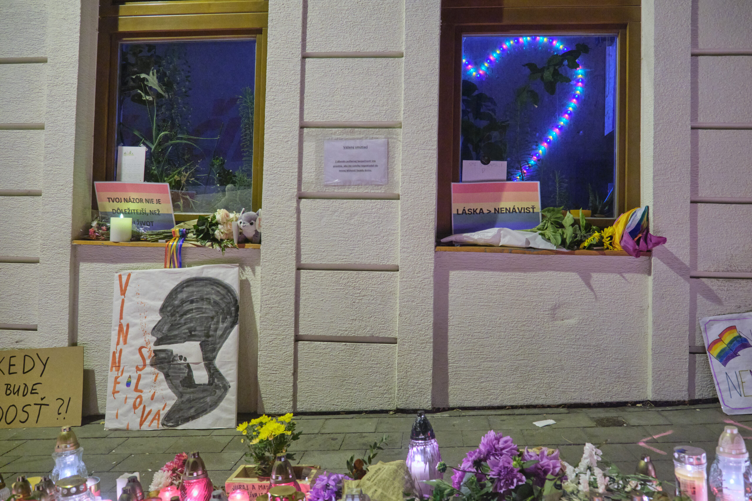 Niemals vergessen! Vor der LGBTI-Bar Tepláren in Bratislava legen Menschen Kerzen und Blumen auf die Straße. Juraj und Matúš wurden am Mittwoch bei einem mutmaßlichen faschistischen Terroranschlag ermordet. Jetzt nehmen die Menschen Abschied von den beiden jungen Männern. pic.twitter.com/7oz5zCKhnV