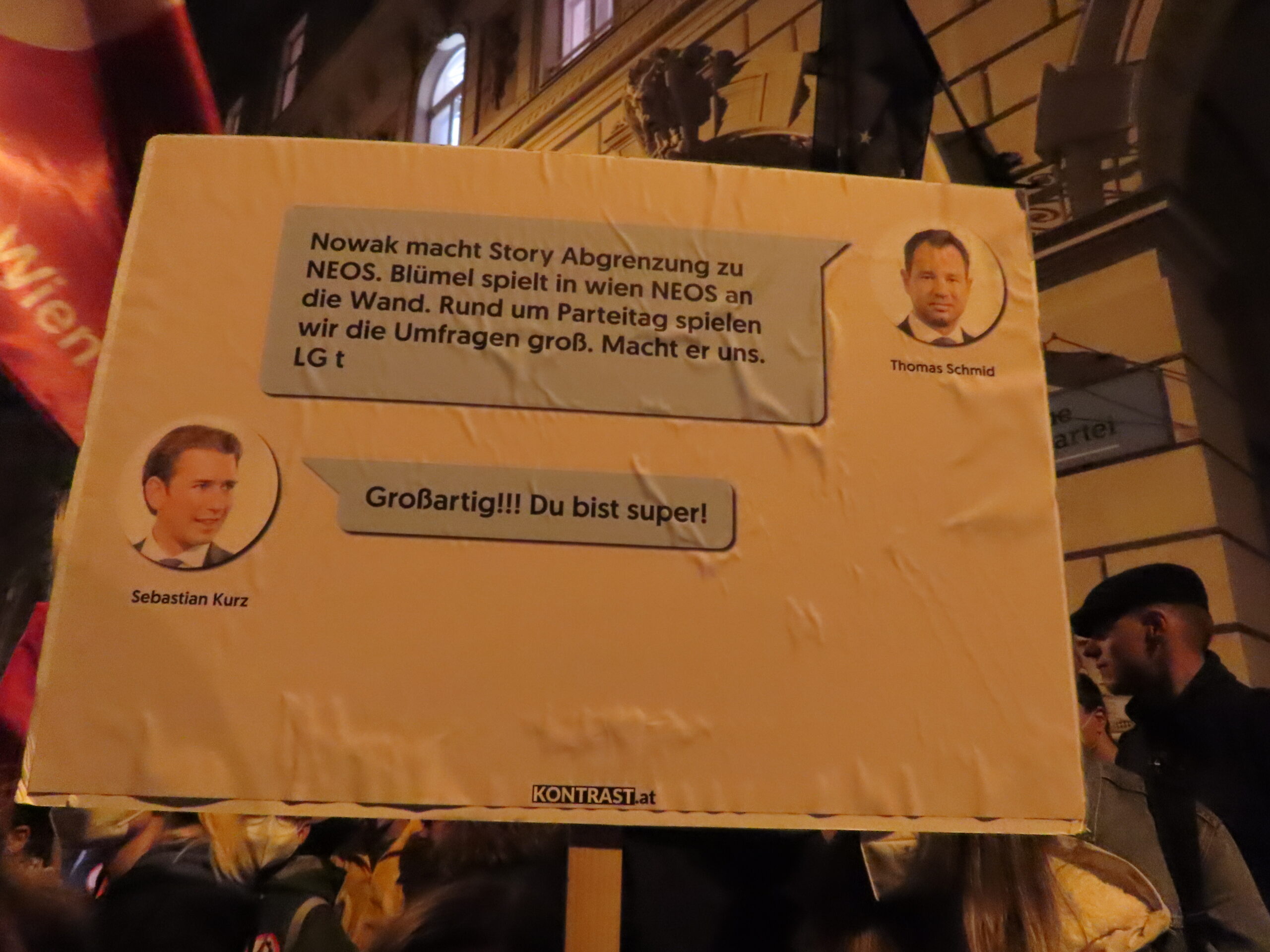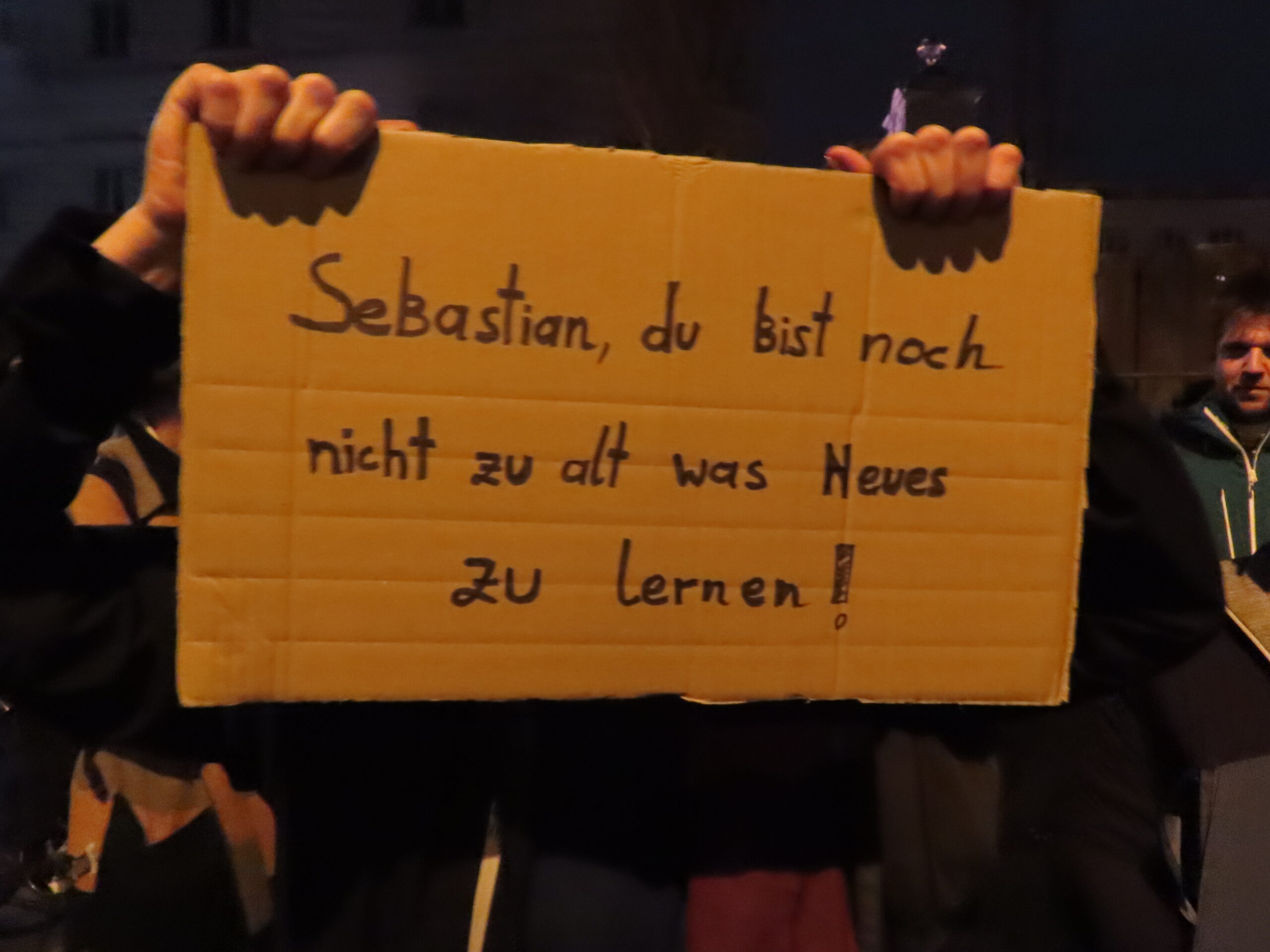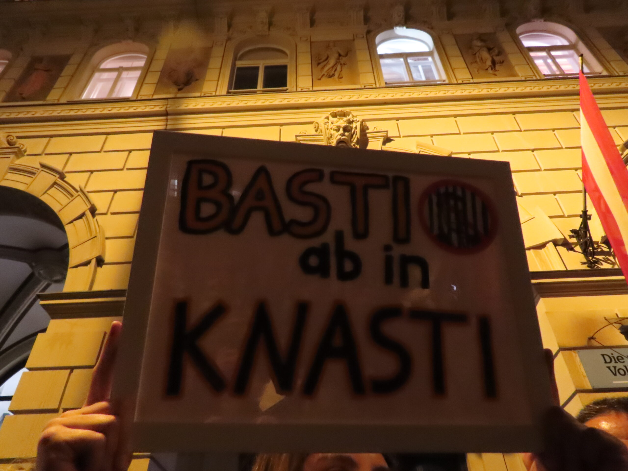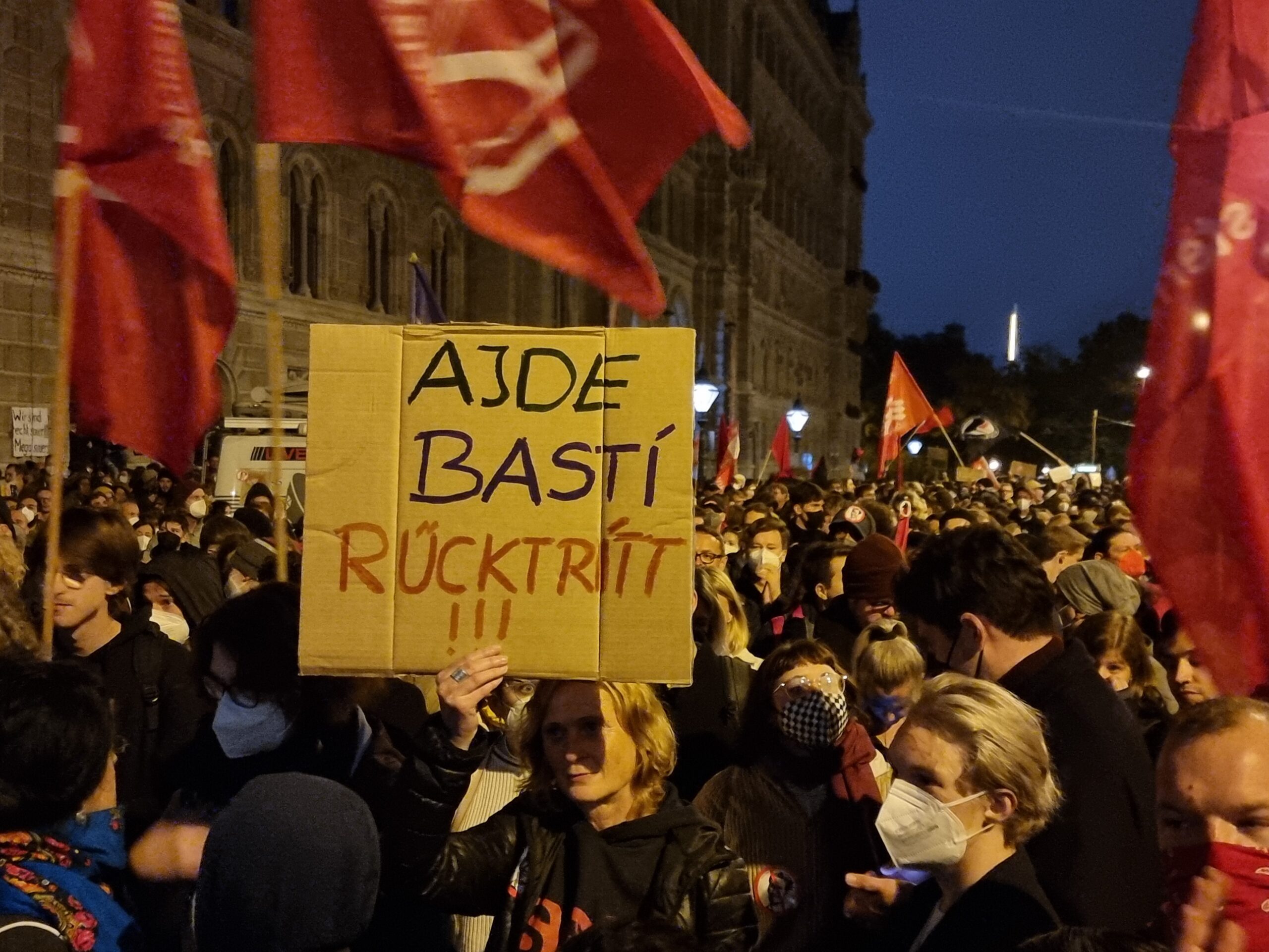 „Basti raus!“ und „Nieder, nieder, nieder mit der ÖVP!“. Lautstark demonstrierten am Donnerstagabend tausende Menschen vor der ÖVP-Zentrale in der Wiener Lichtenfelsgasse. Aufgerufen zur Demo hatte ein Bündnis aus linken Organisationen, vor allem den sozialdemokratischen Jugendorganisationen sowie der Wiener Partei LINKS. Gekommen waren nach Angaben der Veranstalter*innen bis zu 7000 Menschen.