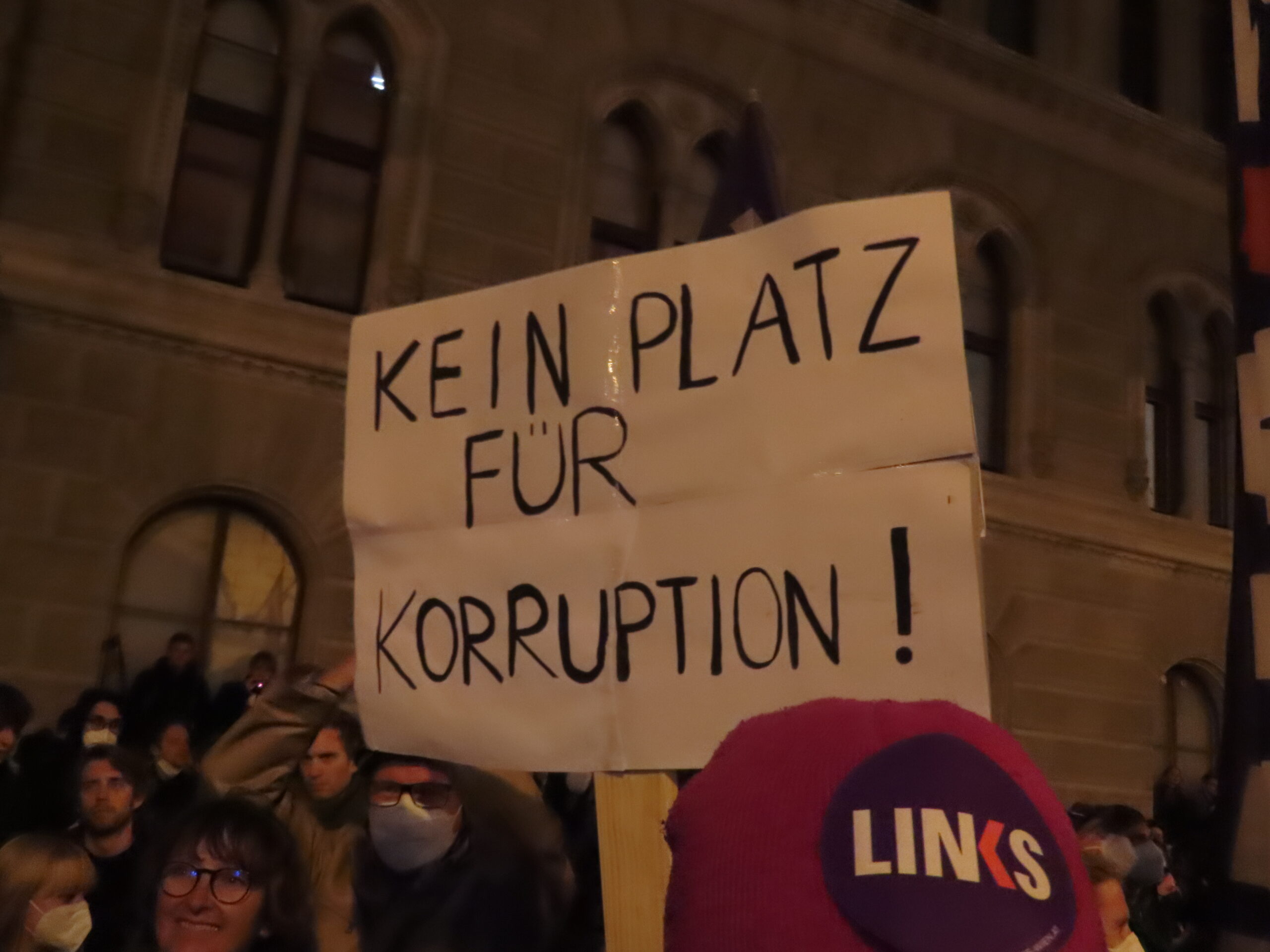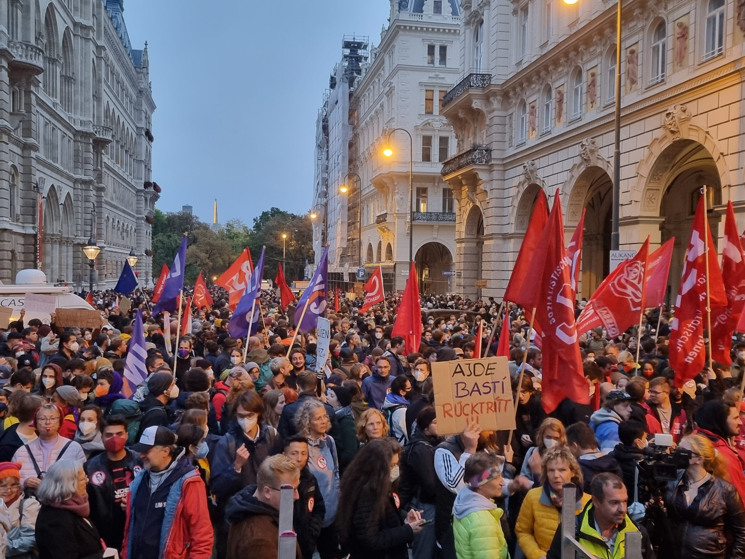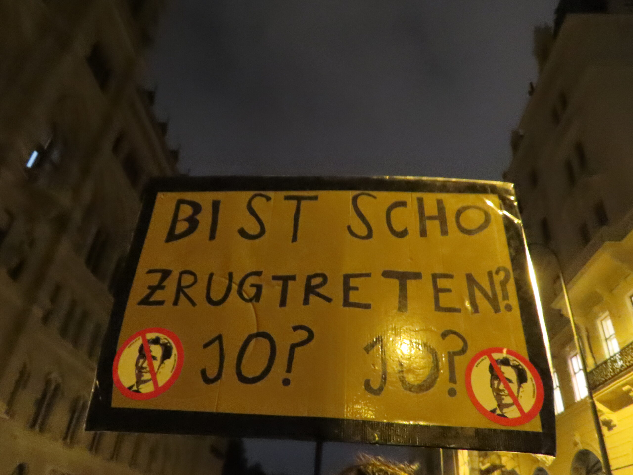 „Basti raus!“ und „Nieder, nieder, nieder mit der ÖVP!“. Lautstark demonstrierten am Donnerstagabend tausende Menschen vor der ÖVP-Zentrale in der Wiener Lichtenfelsgasse. Aufgerufen zur Demo hatte ein Bündnis aus linken Organisationen, vor allem den sozialdemokratischen Jugendorganisationen sowie der Wiener Partei LINKS. Gekommen waren nach Angaben der Veranstalter*innen bis zu 7000 Menschen.