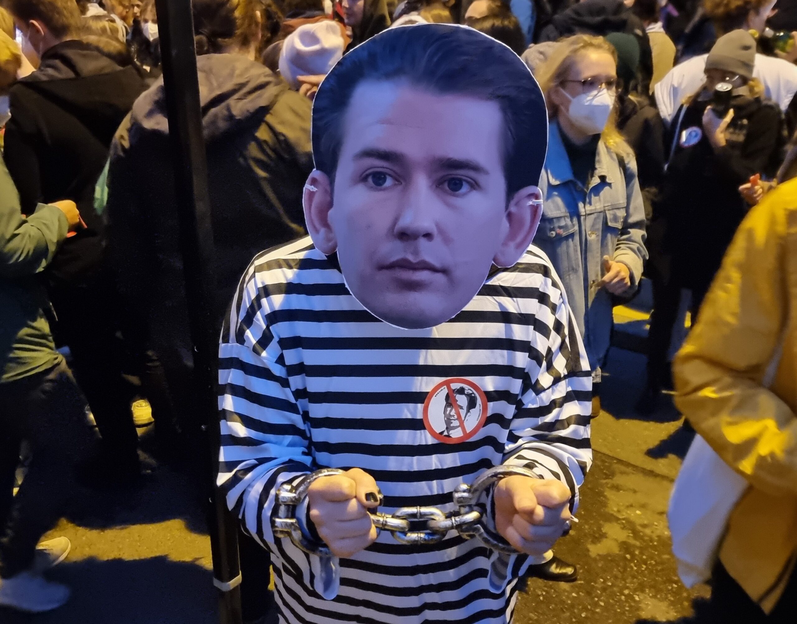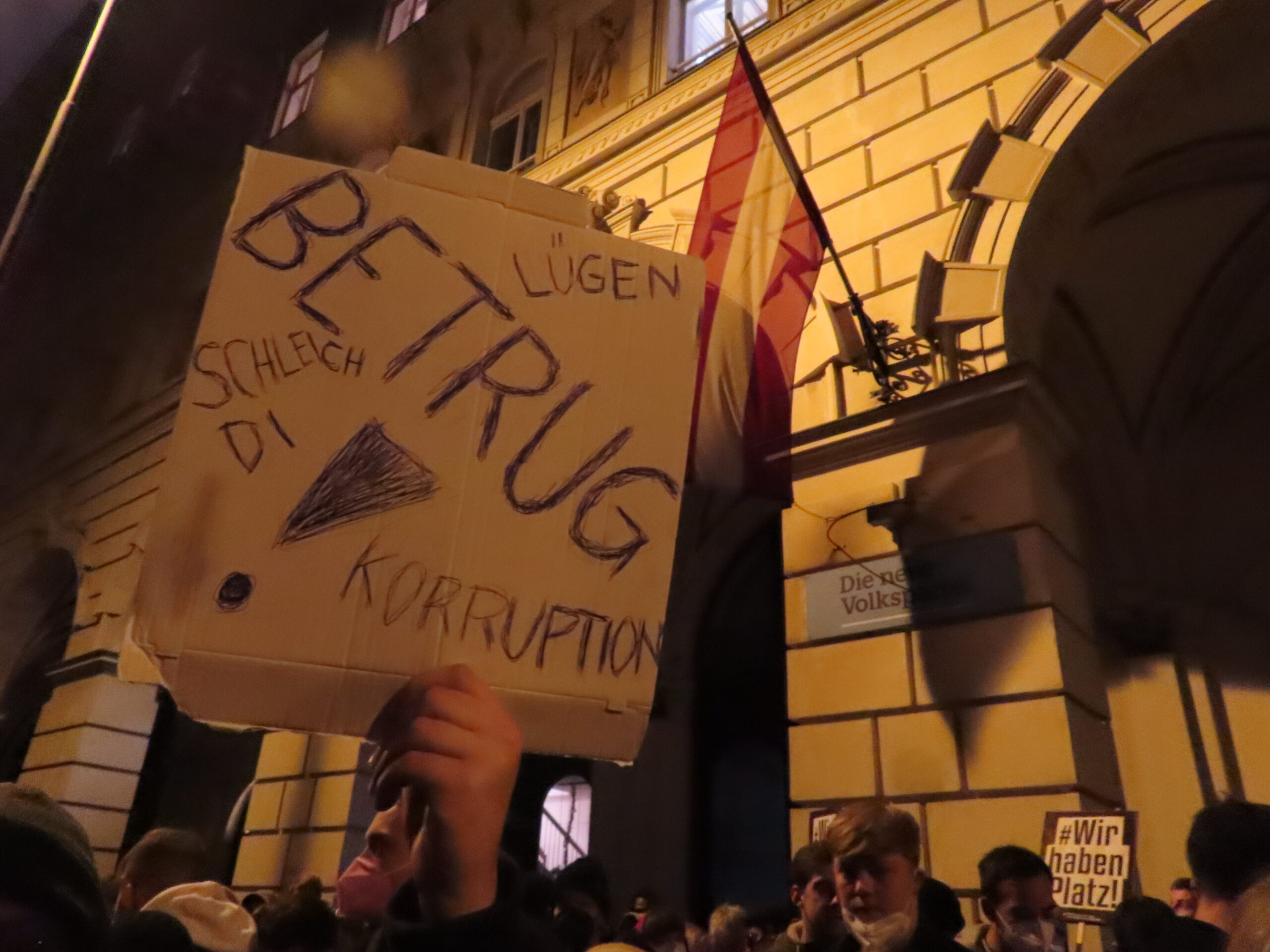 Im Anschluss an die Kundgebung vor der ÖVP-Zentrale zogen hunderte Menschen weiter zum nahe gelegenen Heldenplatz und demonstrierten vor den Containern, wo derzeit ein Teil des Parlaments untergebracht ist. Dort sollte zu diesem Zeitpunkt eine Sitzung der ÖVP stattfinden. Dort schwenkten Demonstrant*innen unter anderem Schilder mit Aufschriften wie: „Basti Corrupti“.
