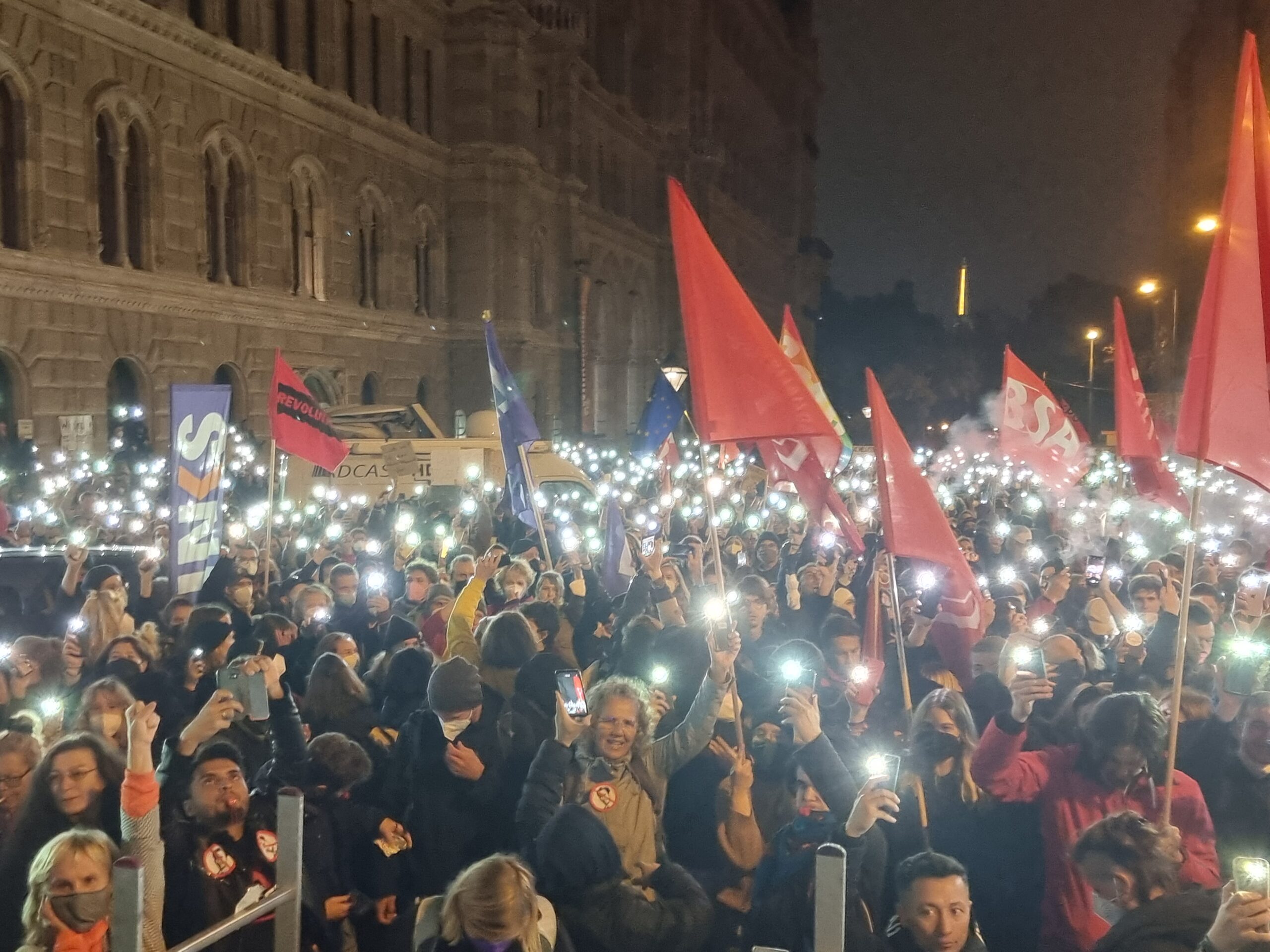 In einer sehr kämpferischen und stark beklatschten Rede sagten die LINKS-Sprecher*innen Anna Svec und Can Gülcü, dass es nicht nur um die ÖVP gegen würde, sondern insgesamt um ein besseres Leben für die Menschen in Österreich und um eine andere Gesellschaft. Ihre Rede unterbrachen sie mit Sprechchören wie „A-Anti-Antikapitalista“.